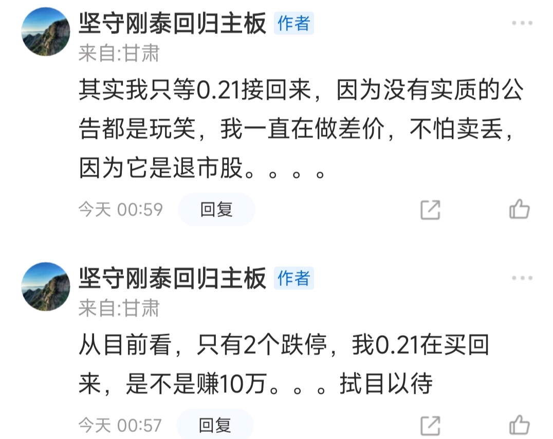 可以放心持有了,终于知道了,上周0.23成交量都是IP甘肃,@坚守刚泰回归主板,一个人出的,他现在己经被洗出去了大部分,他啥也不知道,搞IP地址忽悠你们做T,还想在0.21接回。这次开会董事会有几个大佬叁加,具体的情况,股吧不便说