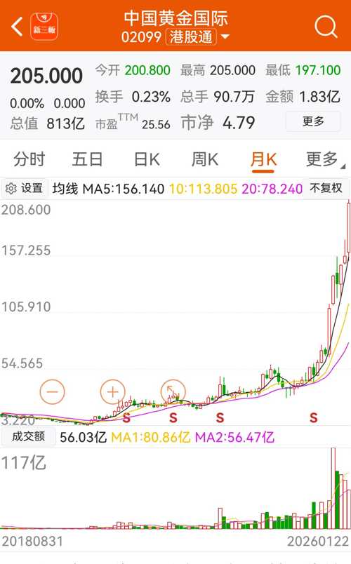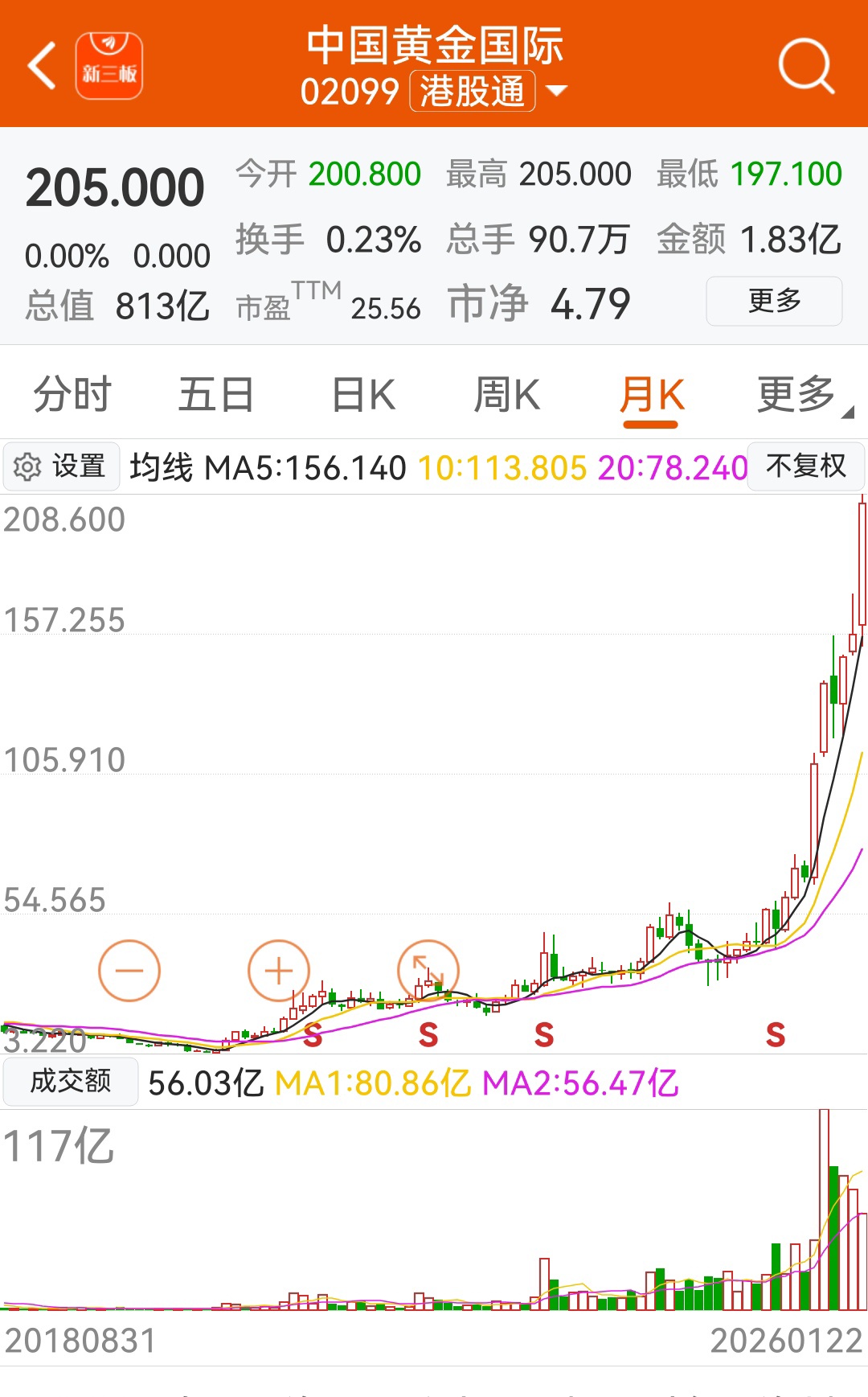 在香港上市的中国黄金国际(02099)居然从3块多涨到了200多!