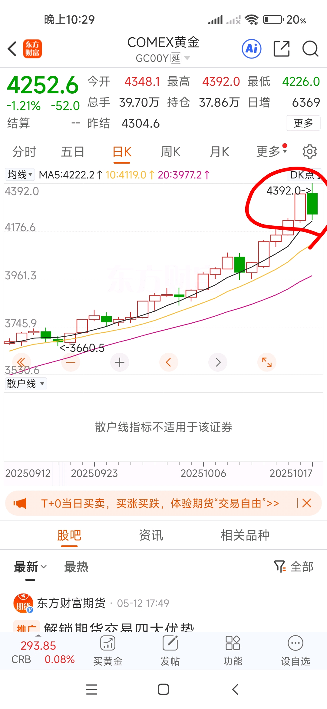 $工新5(SZ400100)$ $秋林3(SZ400101)$ $S佳通(SH600182)$ 黄金4400到4200的位置是到顶了,真的是到顶啦。