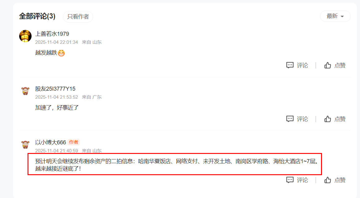 还剩3个没进行二拍:金海翠林未开发土地、南岗区学府路、海怡大酒店1~7层。要么今晚公布二拍信息,要么明天公布二拍信息。