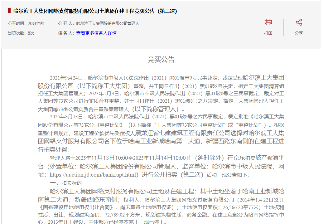 新增二拍信息:哈南华夏饭店+网络支付公司土地。