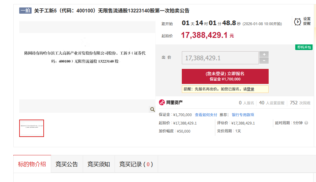 估计流拍,到现在0人报名,事情有时候发展很快,以后不一定这个价能买到。