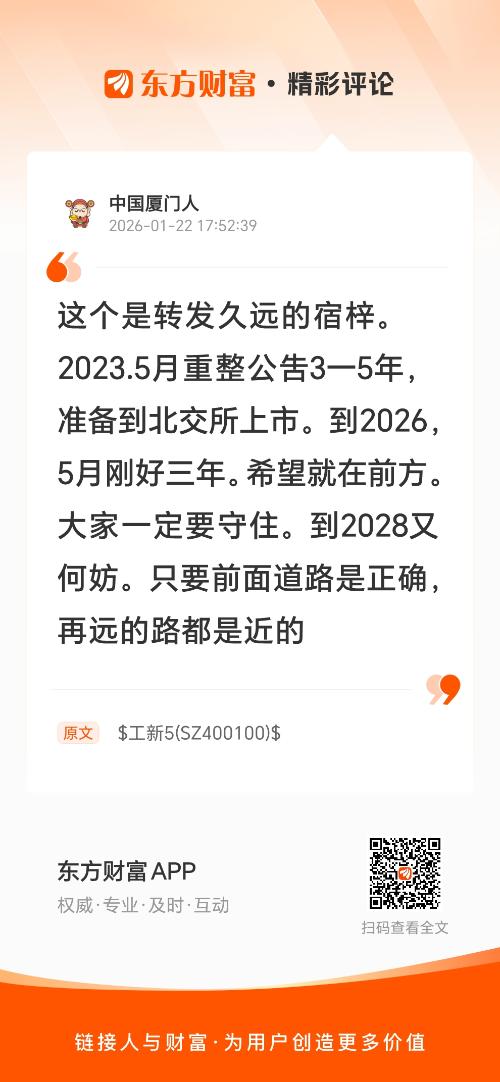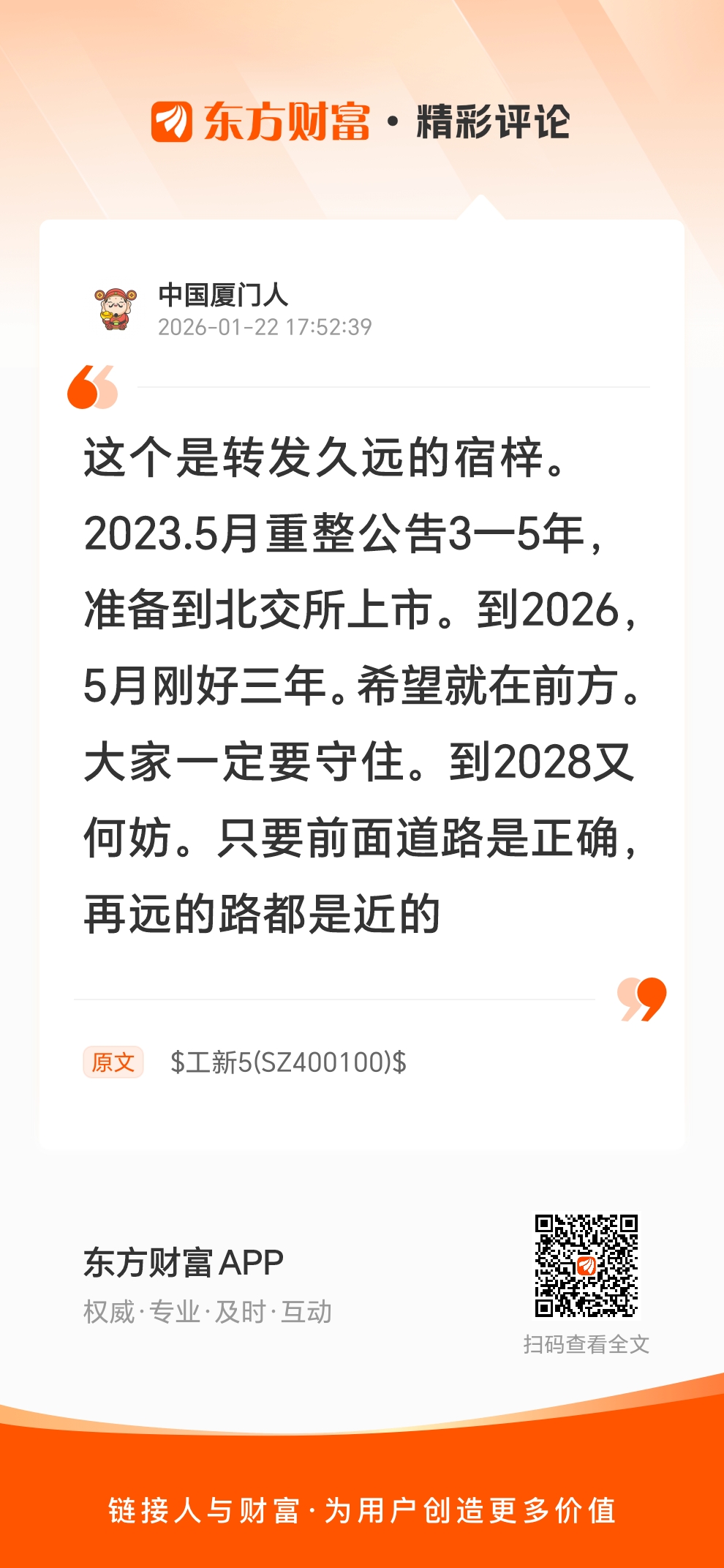 这个是转发久远的宿梓。2023.5月重整公吿3一5年,准备到北交所上市。到2026,5月刚好三年。希望就在前方。大家一定要守住。到2028又何妨。只要前面道路是正确,再远的路都是近的 我在《$工新5(SZ400100)$》的评论获得了大家的关注。
