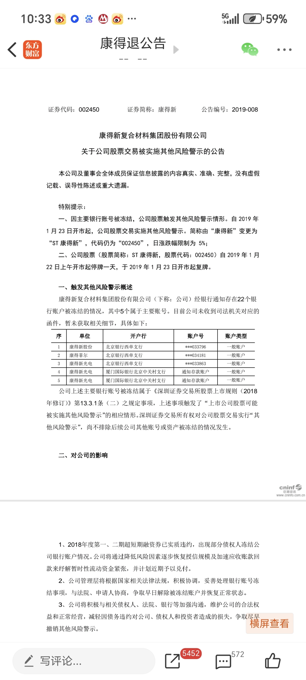 康得新被st原因是主要银行账号被冻结,立案调查并不会被st哦。以暴露经营性危机的