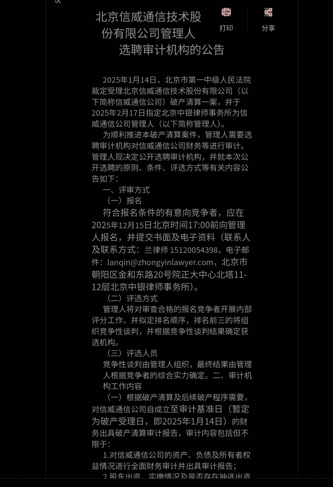 北京信威通信技术股份有限公司的破产管理人,是规范的。进行了严格的审计机构选聘。而