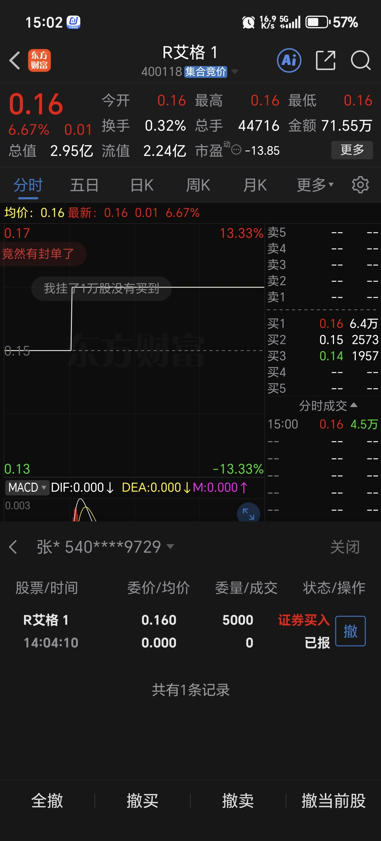 $R艾格 1(SZ400118)$ 表示没有买到