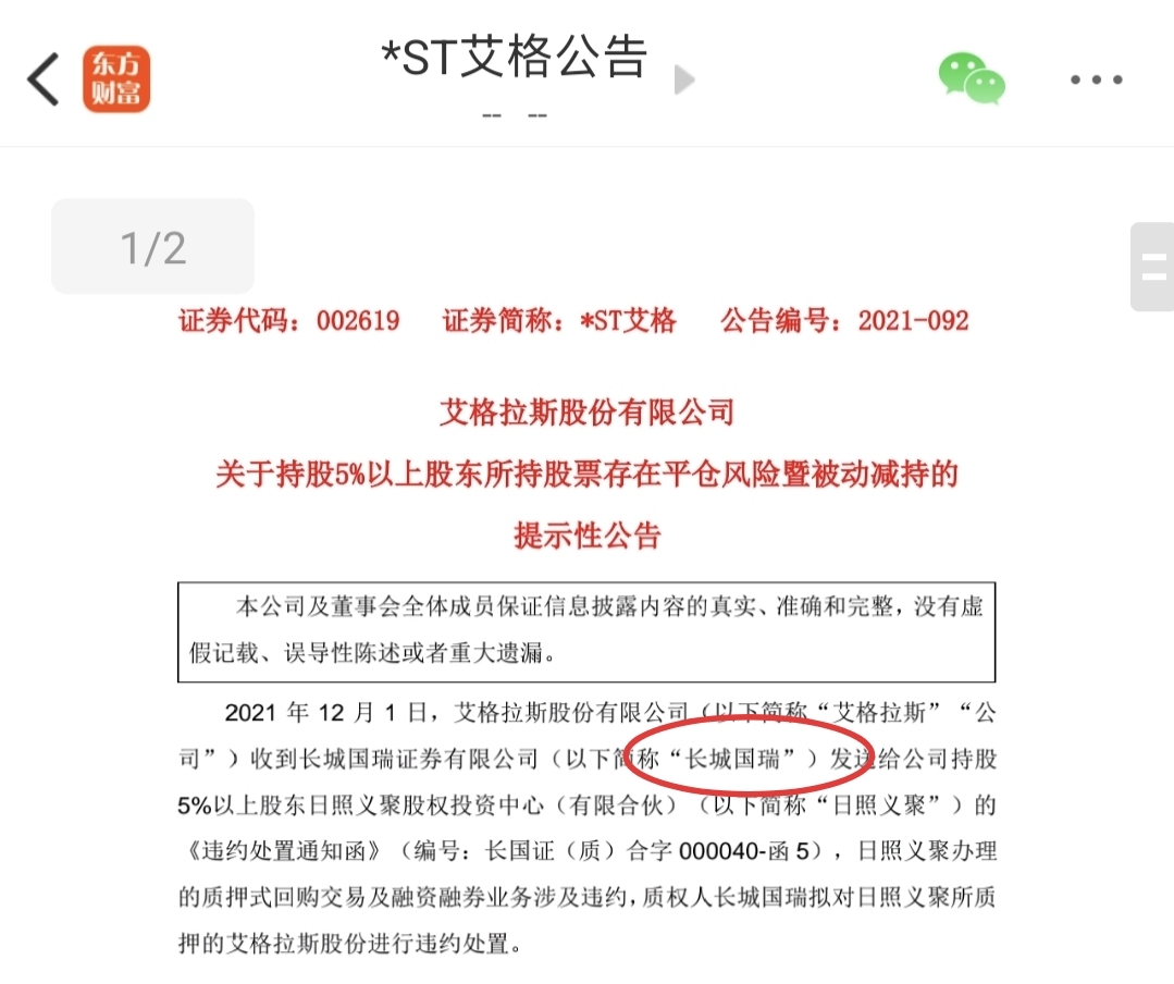 长城国瑞退市前作为日照义聚股份质权人,平仓日照义聚股份,间接造成艾格股票面值持续