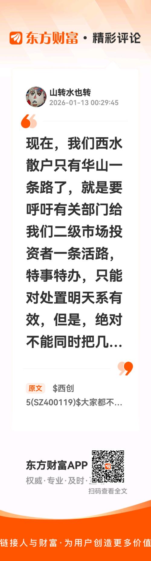 //@山转水也转 :现在,我们西水散户只有华山一条路了,就是要呼吁有关部门给我们二级市场投资者一条活路,特事特办,只能对处置明天系有效,但是,绝对不能同时把几万二级市场合法投资者的资产一起特事特办了。五年过去了,我们的申诉文件发送到了可以想得到的任何地方,但是,除了得到了一些空洞的承诺,我们没看到任何行动,在清算明天系资产的最后阶段,我们只能再借股吧发出我们微弱的求救信号,再次强调,我们不是明天系,我们跟肖老板十个杆子都打不着,我们只是看好天安财险,投资了天安财险,想当一下天安财险的股东,仅此而已。现在,我们的天安财险飞到了申能财险哪里,没有转让公告,仅以577亿逾期债为理由应该也有待证实,九年以来,天安财险一直在特事特办,希望在收尾阶段,再来一次特事特办,让申能财险整体把天安财险连同他的中小股东一并收入麾下,这样起码可以理顺了几万投资了天安财险的中小股东的合法权益。