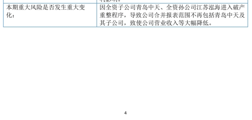 $R天源1(SZ400121)$ 2022年年报第4页:“因全资子公司青岛中天、全资孙公司江苏泓海进入破产重整程序,导致公司合并报表范围不再包括青岛中天及其子公司,致使公司营业收入等大幅降低。”