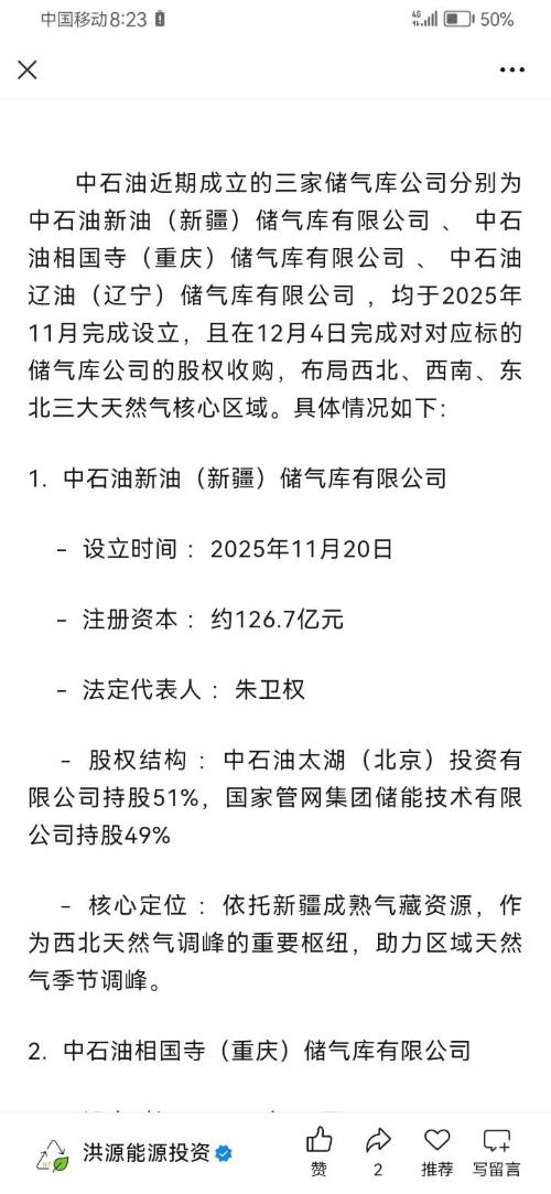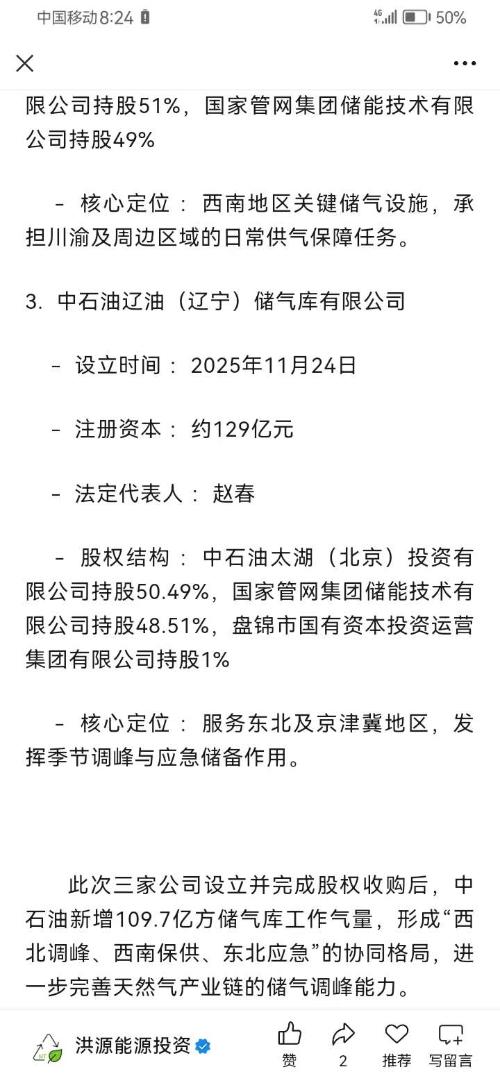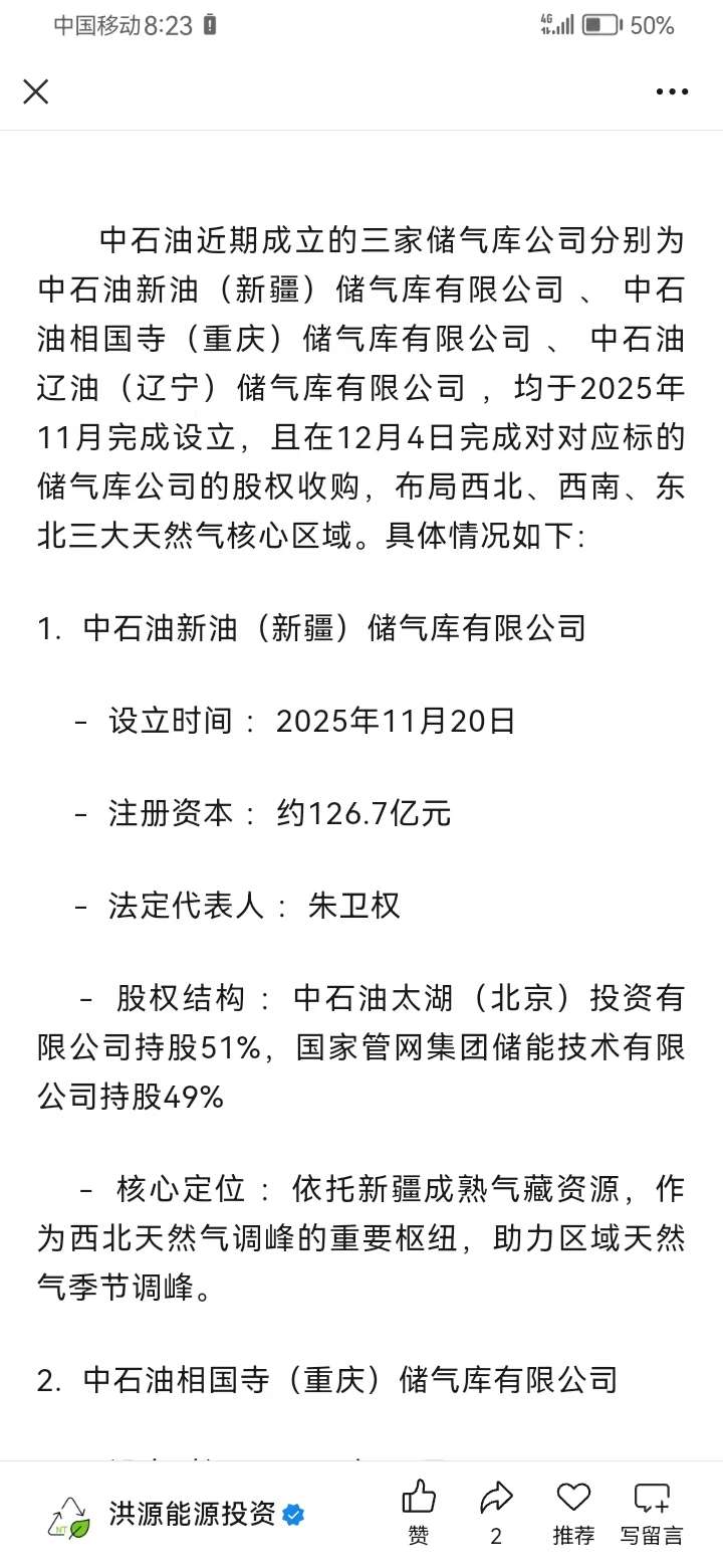 中石油和国家管网持股11月份成立3家储气库公司,华丰中天已经接入国家管网,月底码
