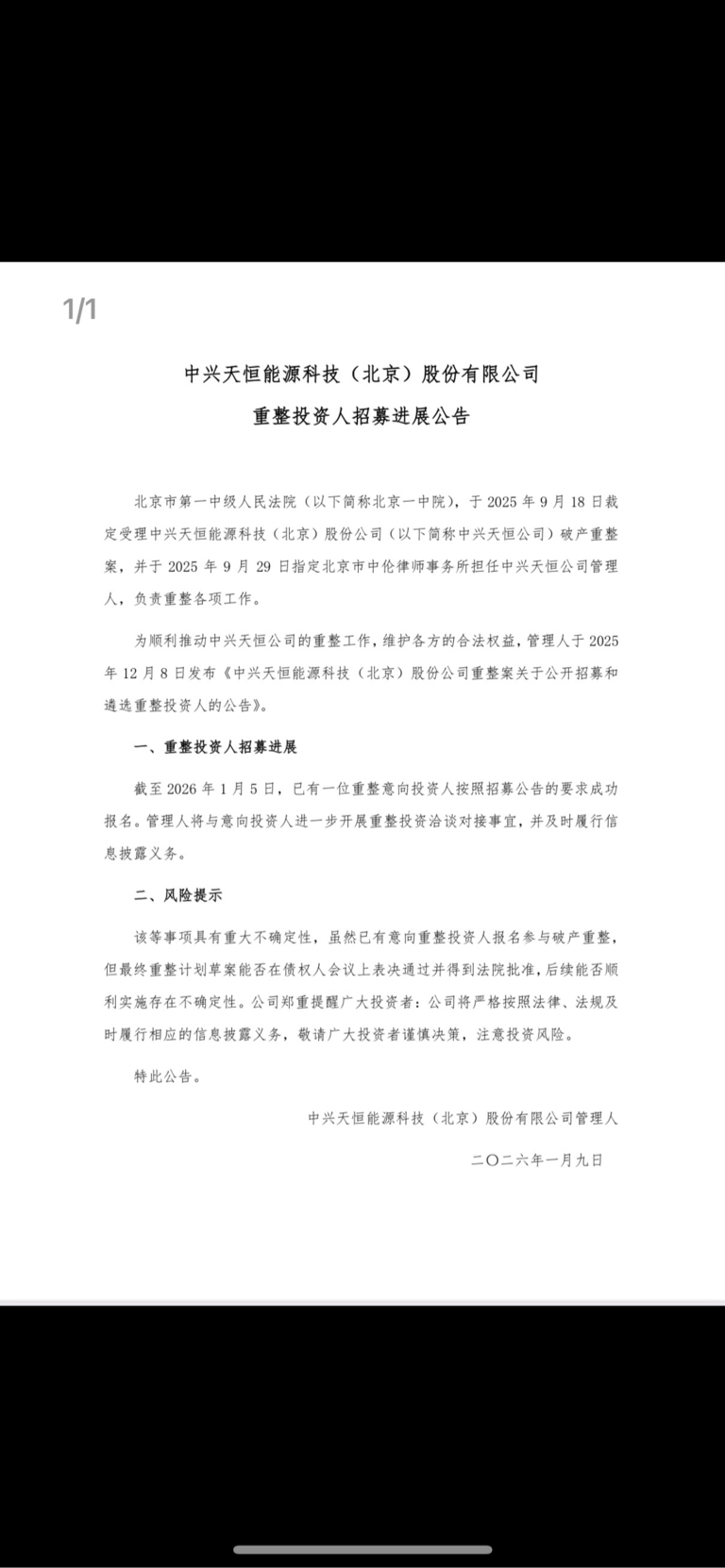 恭喜天源,恭喜坚守的各位铁头,公告天源已经有投资重整人报名了,天源重整正式启动了!不管是谁,只要有投资人就是重大利好,可以重整总比清算好,不管是谁,只要重整成功了就有上市的机会,天源的价值才能真正体现,百亿上市不是梦,五年千亿市值不是梦!加油天源,感恩天源的管理层董事会,感恩战略投资人!