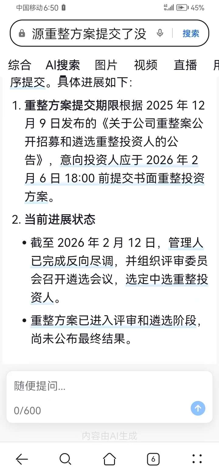 2月10号召开债权会议,2月12号重整方案已进入评审和遴选,等结果公布
