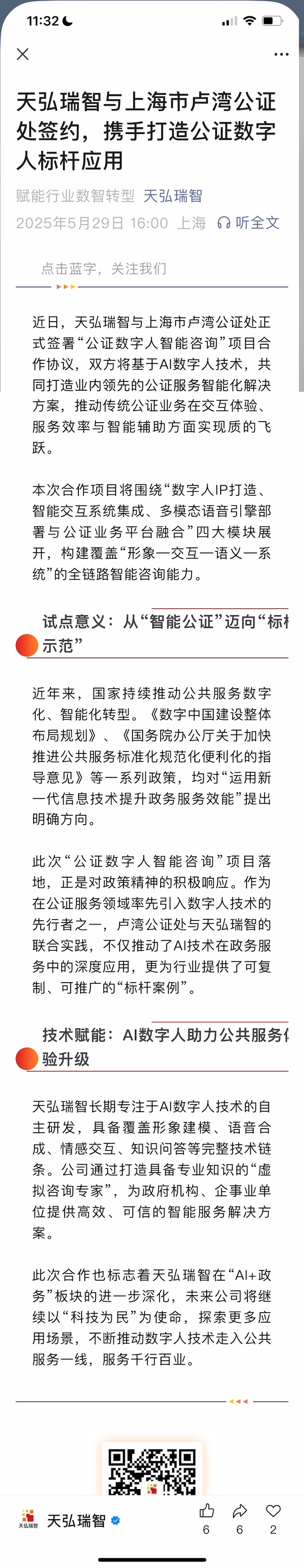 $当代3(SZ400147)$ 当代子公司天弘瑞智与上海市卢湾公证处签约,携手打造公证数字人标杆应用在“AI+政务”板块,体现公司在人工智能赛道的发展,此应用可以广泛复制应用到政务中心,电视台,交通指挥中心等场景。
