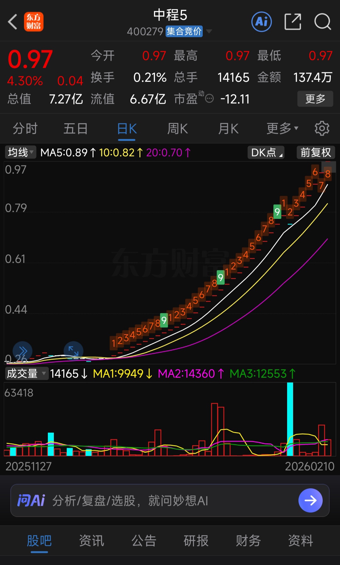 当代3估计三四个涨停就会放量看中程5接力这么猛都三十几个涨停了上涨真是不言顶预计