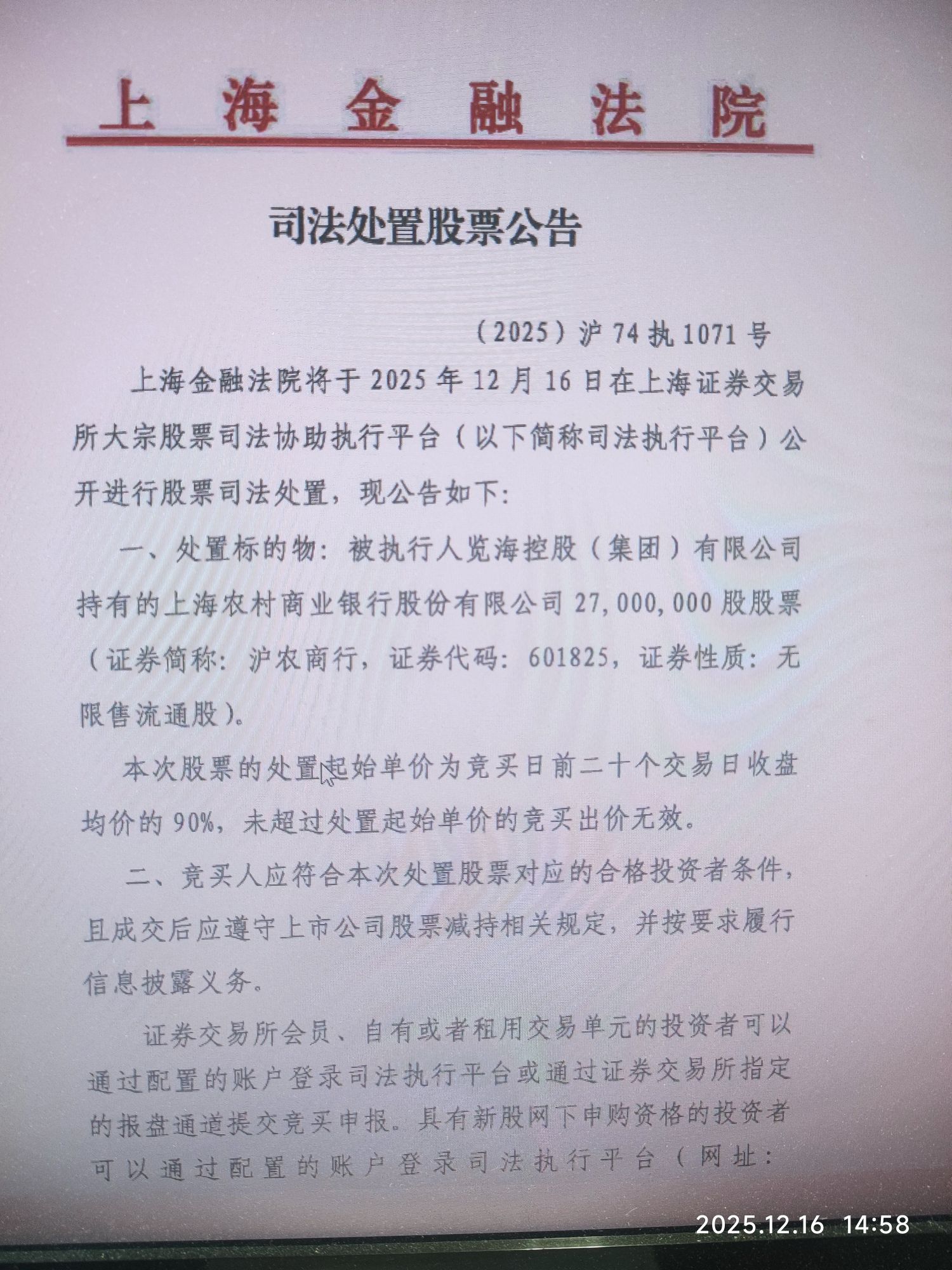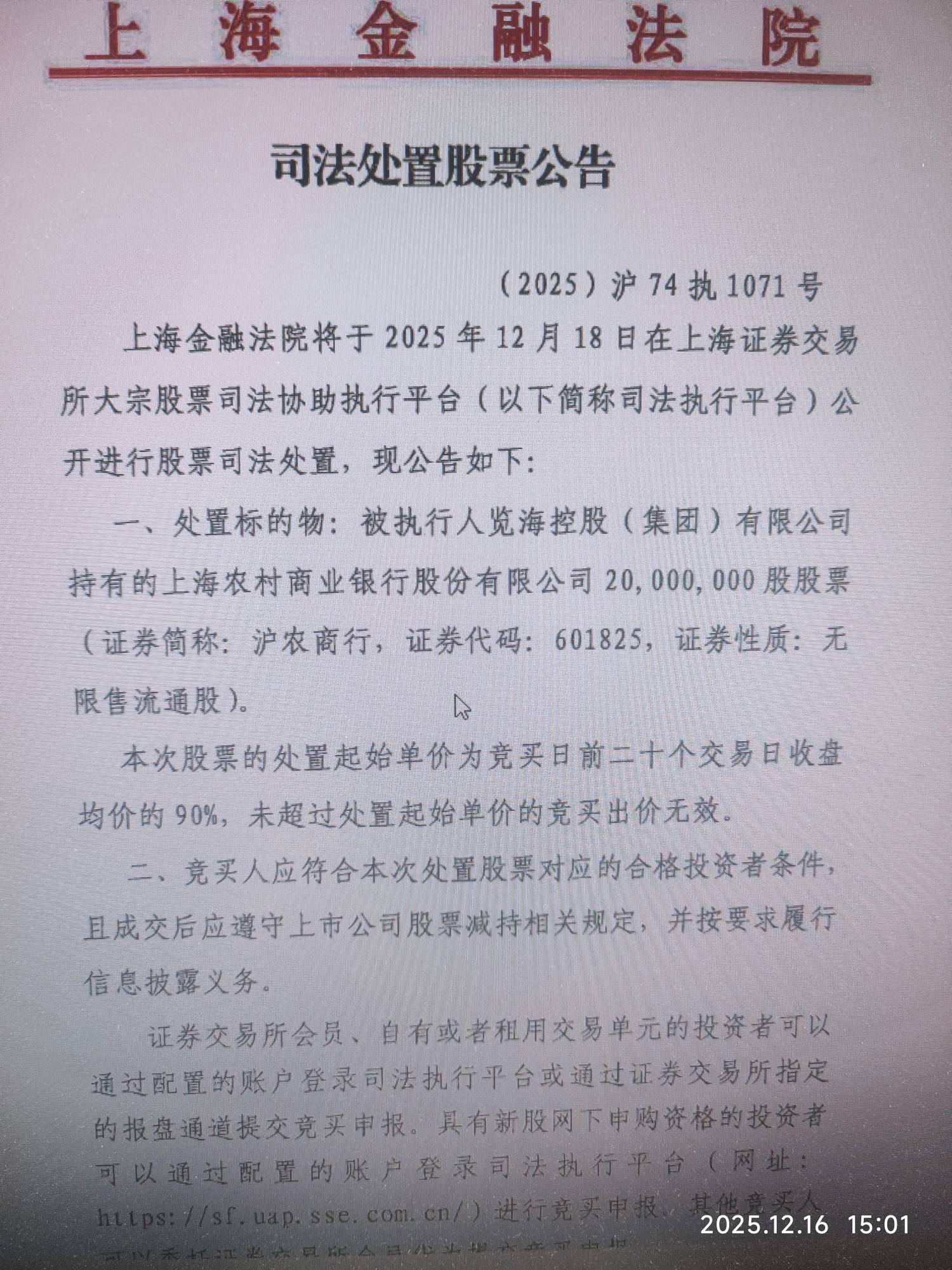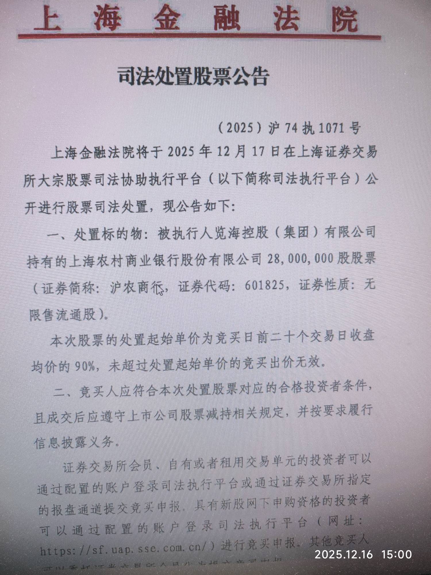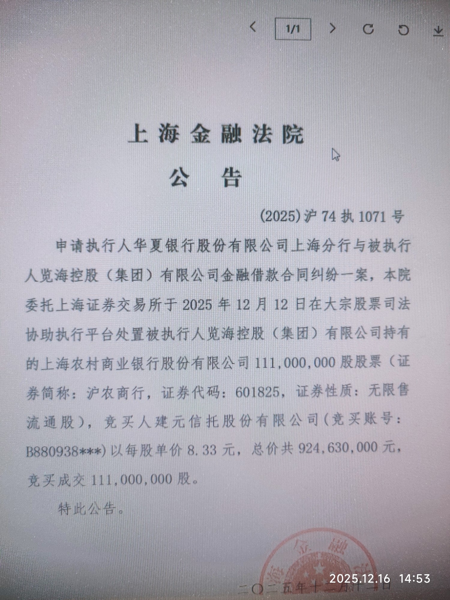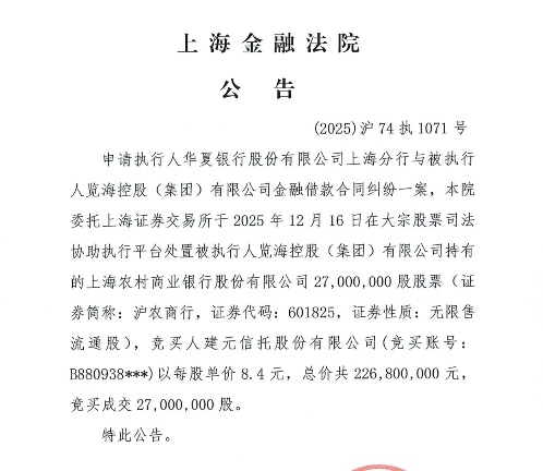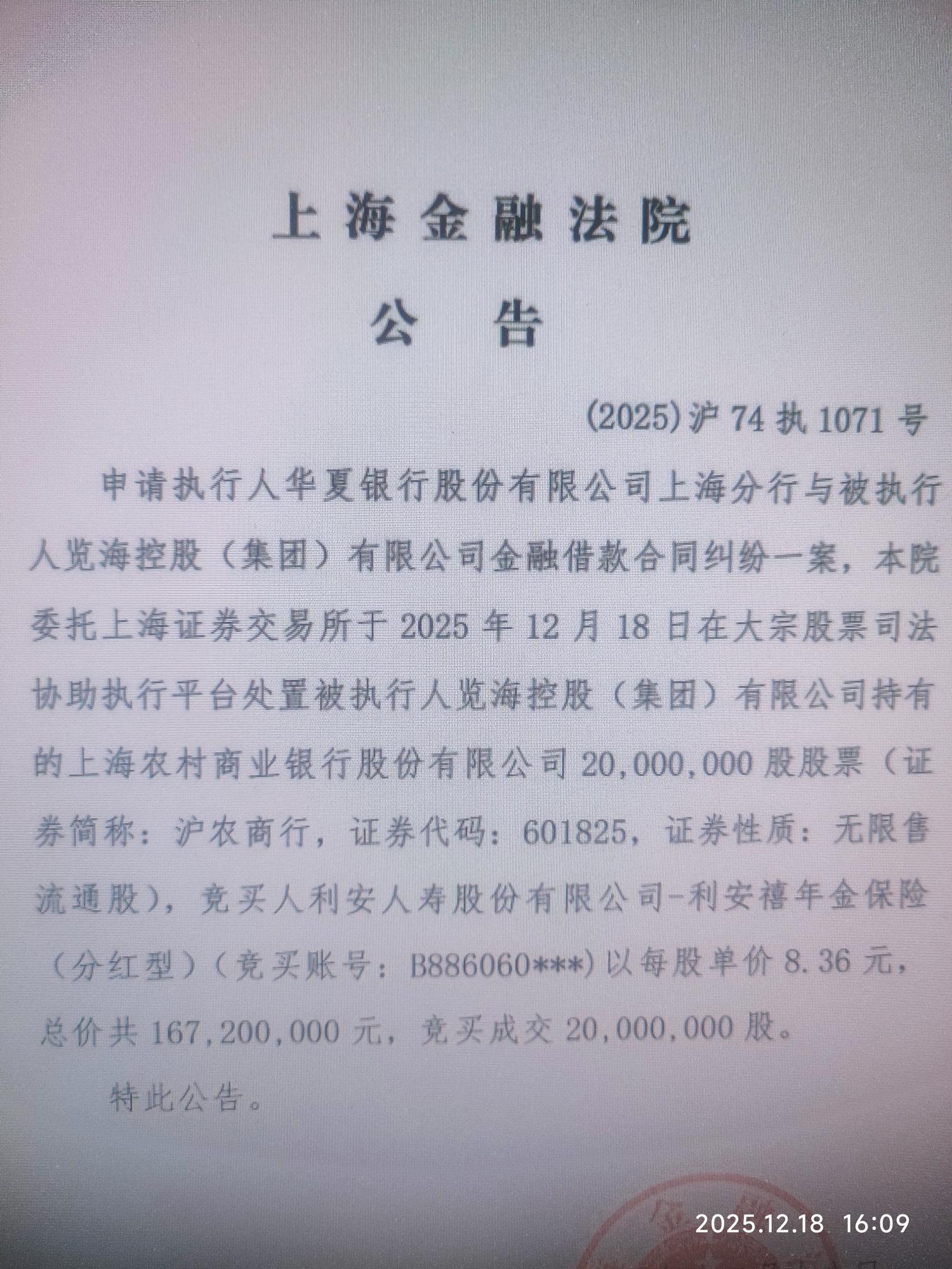 合计1.86亿股,约15.4亿,览海将清空名下所有沪农商行股份