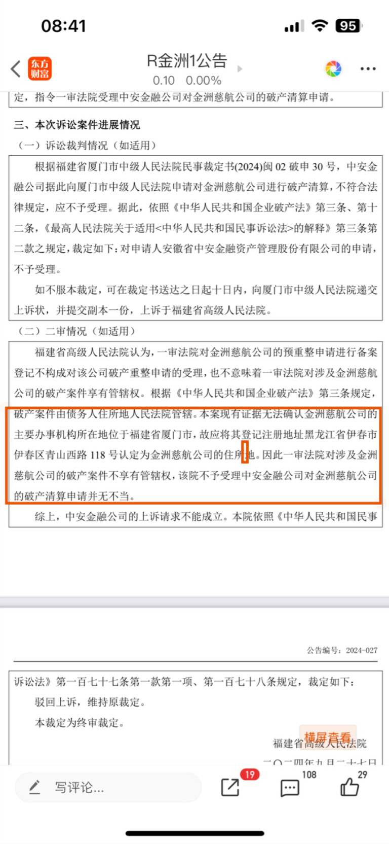 $R金洲1(SZ400161)$ 意思是厦门法院驳回清算的原因,仅仅是因为没有管辖权~那这段时间中安有没有去黑龙江申请破产清算?这是个问题