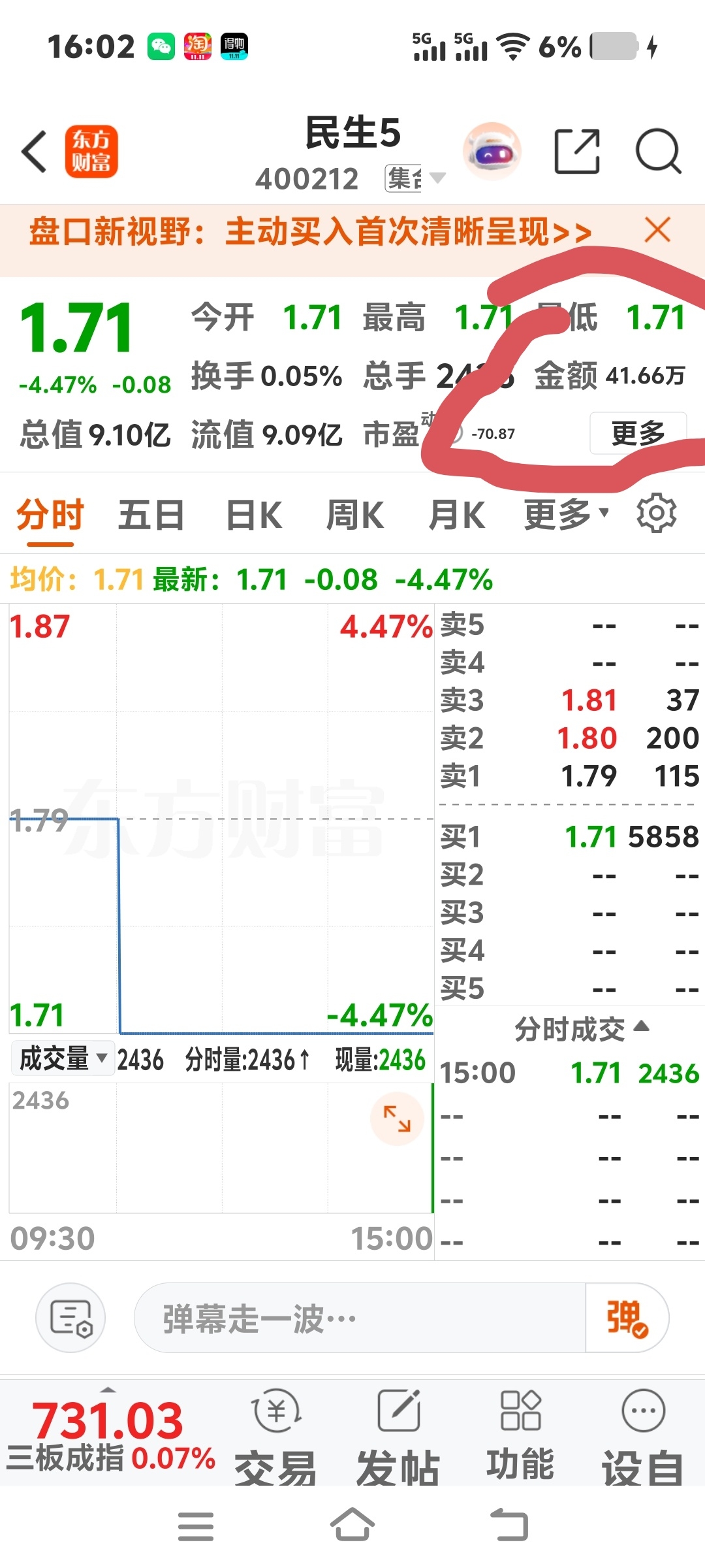兄弟们心心念念的董事长杨前林主导的民生5,九亿的市值今天砸一个跌停只成交了四十多