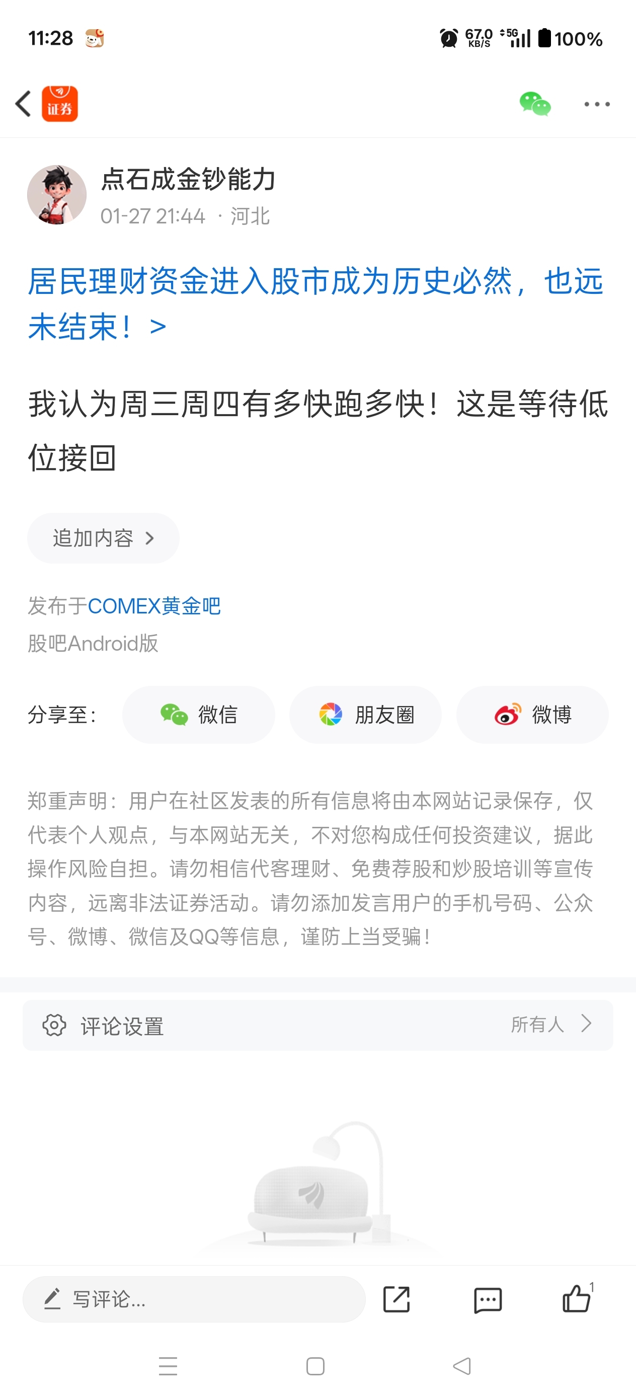 温馨提示: 1.根据《证券法》规定,禁止编造、传播虚假信息或者误导性信息,扰乱证券市场;2.用户在本社区发表的所有资料、言论等仅代表个人观点,与本网站立场无关,不对您构成任何投资建议。用户应基于自己的独立判断,自行决定证券投资并承担相应风险。《东方财富社区管理规定》