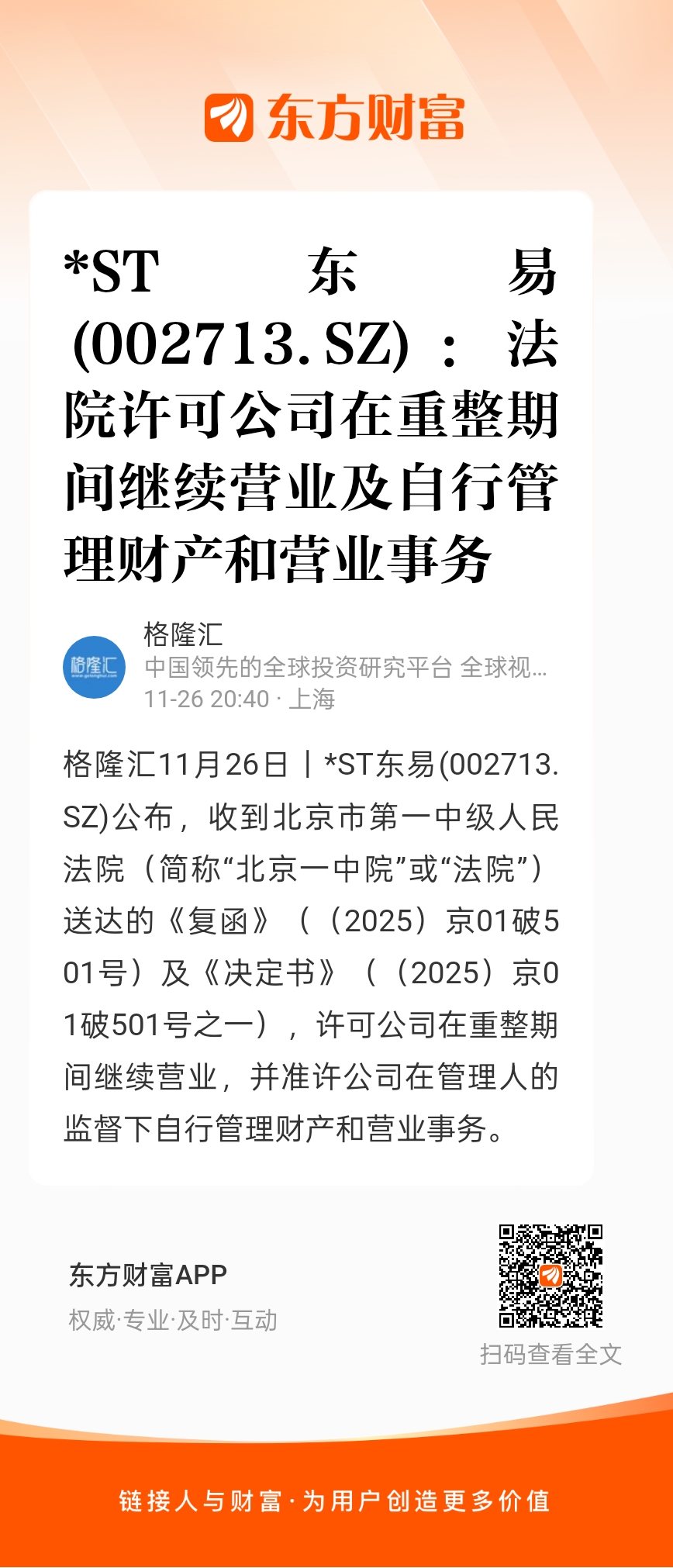 格隆汇11月26日丨*ST东易(002713.SZ)公布,收到北京市第一中级人民法院(简称“北京一中院”或“法院”)送达的《复函》((2025)京01破501号)及《决定书》((2025)京01破501号之一),许可公司在重整期间继续营业,并准许公司在管理人的监督下自行管理财产和营业事务。