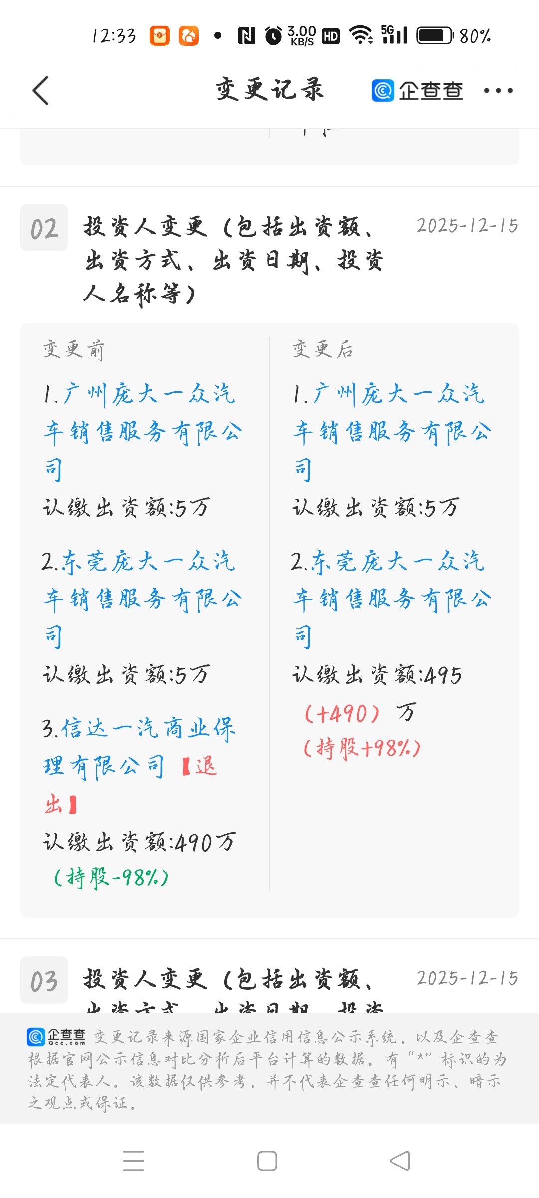 这份图片是企查查上的企业投资人变更记录页面,核心是2025年12月15日某企业完成的投资人及出资额调整,具体变更内容解读如下: 变更核心内容 1.退出方:信达一汽商业保理有限公司退出投资,其原本认缴出资额490万(持股98%),此次变更后不再是该企业投资人。2.出资额调整方:东莞庞大一众汽车销售服务有限公司的认缴出资额从5万增至495万(增加490万),持股比例随之提升至98%。3.无变化方:广州庞大一众汽车销售服务有限公司认缴出资额保持5万不变,未参与此次出资及持股比例调整。 变更背后的逻辑推测 1.股权整合:东莞庞大一众通过承接信达一汽商业保理的出资份额,实现了对标的企业的绝对控股(98%),可能是为了简化股权结构、强化实际控制。2.资本退出:信达一汽商业保理的退出,或出于自身业务调整、投资策略转变,或是与标的企业的合作模式发生变化。