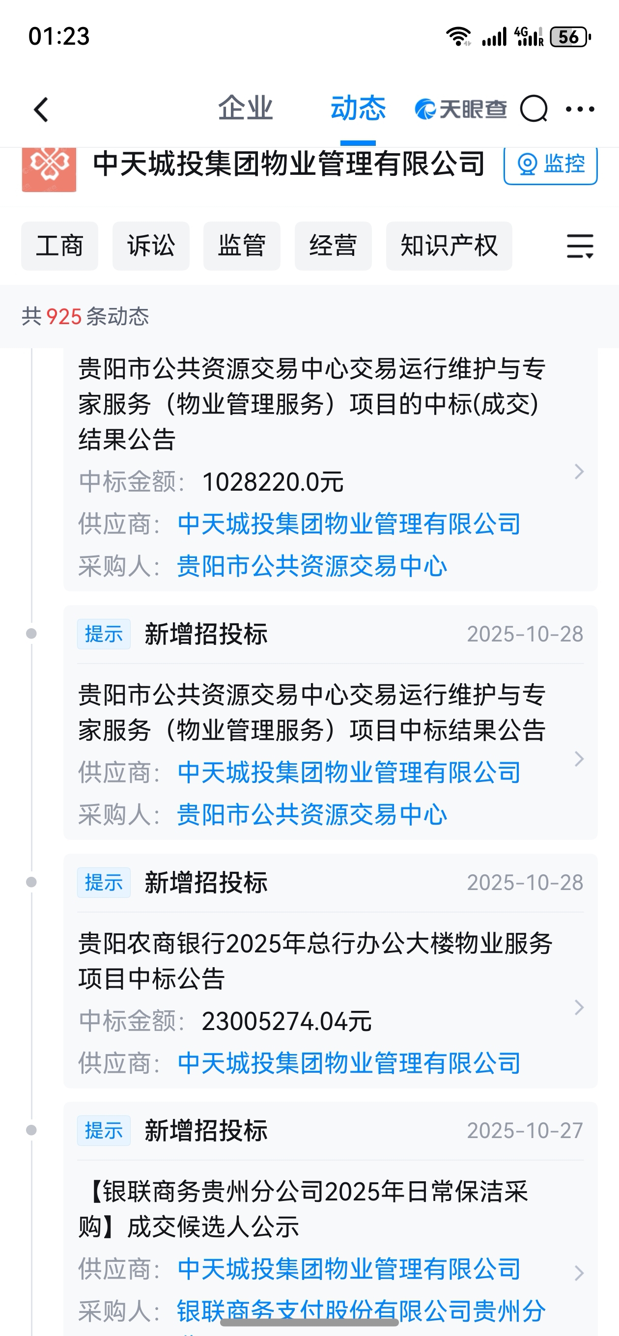 中天金融物业进去破产信托浙商金汇后, 连续中标贵州省政府以及国企的物业标。