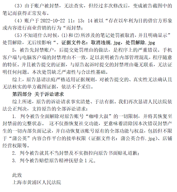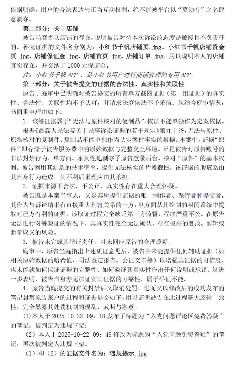 $R和佳1(SZ400175)$ 闲来无事,去上海打了一个小红书封禁账号的官司。我把庭后意见和被告提交的证据发上来,无聊的时候看看吧,解解闷。你觉得能胜诉吗?