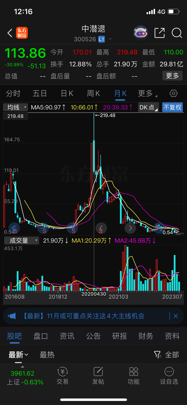 前两周0.2买了40万股,今天加仓10万股,合计收了50万股。中潜具有妖股基因,从200元下跌到2角,反弹到4块可以期待。到时50万股价值200万,我就可以不用上班了。