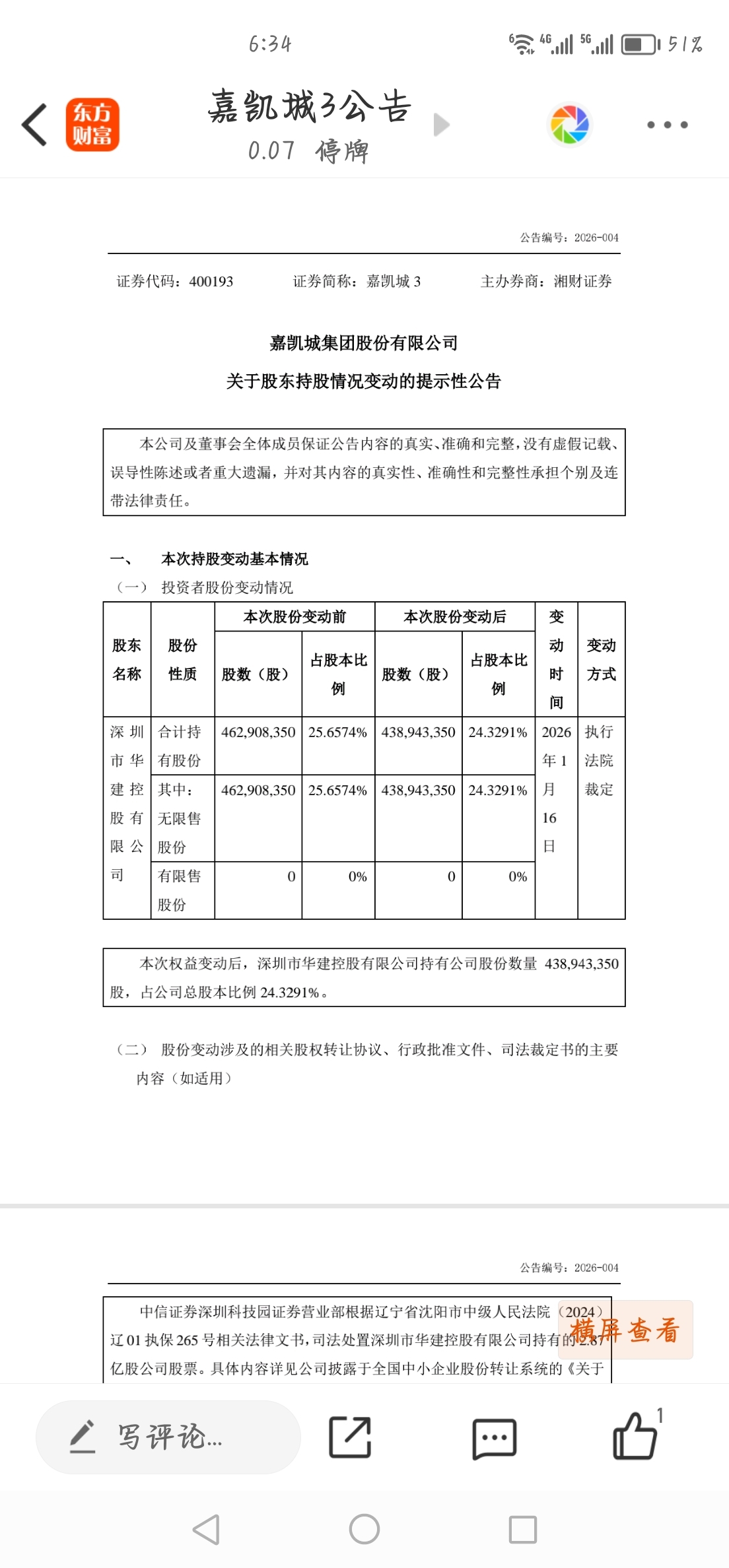 $嘉凯城3(SZ400193)$ 搂了一眼感觉不对。都卖了1亿股了,咋只少了2400万。仔细一看原来只公告了1.16号这一天的,4.62-4.38=0.24。正好对应上当天的成交量。 再算一下5.39-4.38=1.01亿。确实是抛了1亿股了。全部卖完华建股份就只剩2.5亿左右了,占比15%,还能是控股股东吗?