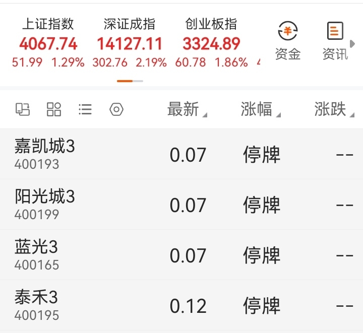 $泰禾3(SZ400195)$ 同样是房地产,同样是一起退到新三板的股票,为什么泰禾你要搞特别?为什么不跟嘉凯城、阳光城、还有蓝光一个价,总是在0.11徘徊,你这样让人琢磨不透,别人不买你买谁?