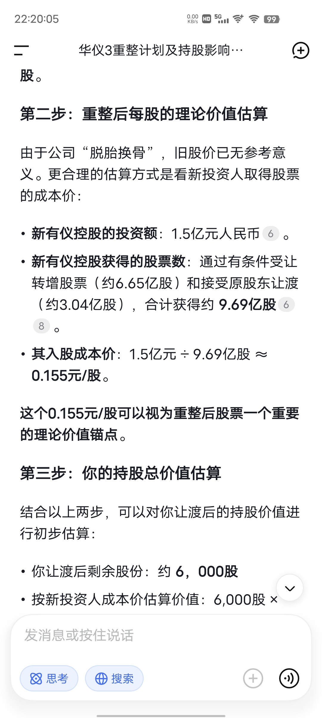 2026新年好。各位懂事长,最后华仪3什么结果?以前亏了的也不要去计较了。假设持有一万股3 让渡股后还剩余多少股,价格是多少?复牌后是怎么个涨跌幅,是每天5%涨停呢还是第一天无限制。大概能到多少?有懂的懂事长说说。不要吓说能到什么几元几十元的或者上回主板等。那也是还要之后几年几十年的事。有可能但你也等不到或者已经早就清了。