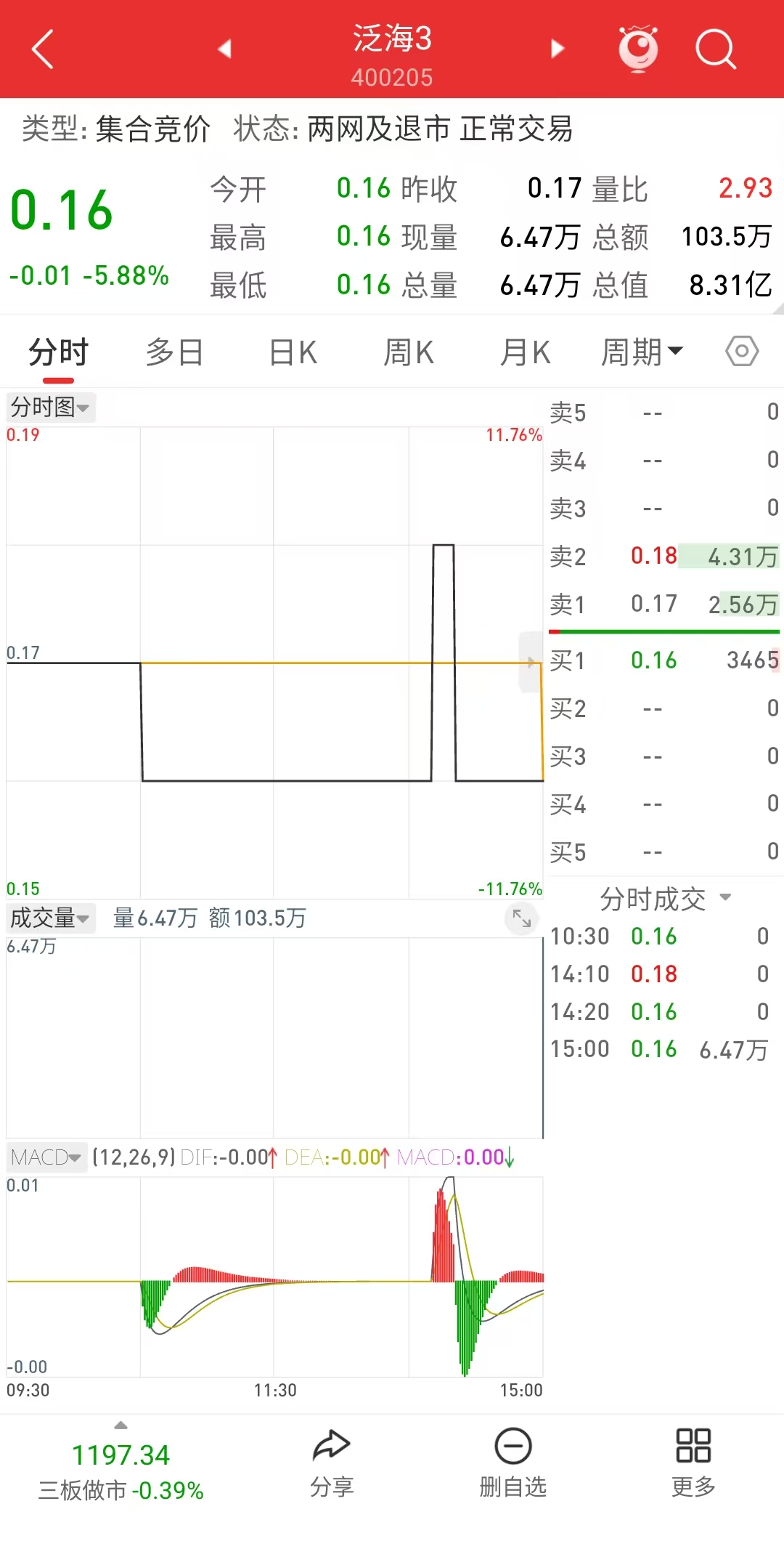 疯了似的上蹿下跳,涨跌幅度极值为±11.76%,当日总成交量6.47万手,成交额103.5万元,盘口挂单里,卖1是0.17元(2.56万手)、卖2是0.18元(4.31万手),买1是0.16元(3465手)。单日集中放量,成交量缺乏持续性,短期资金换手后续难有资金接力支撑上涨,这种无持续量能支撑的下跌,大概率维持震荡或持续跌。周五继续逃脱......