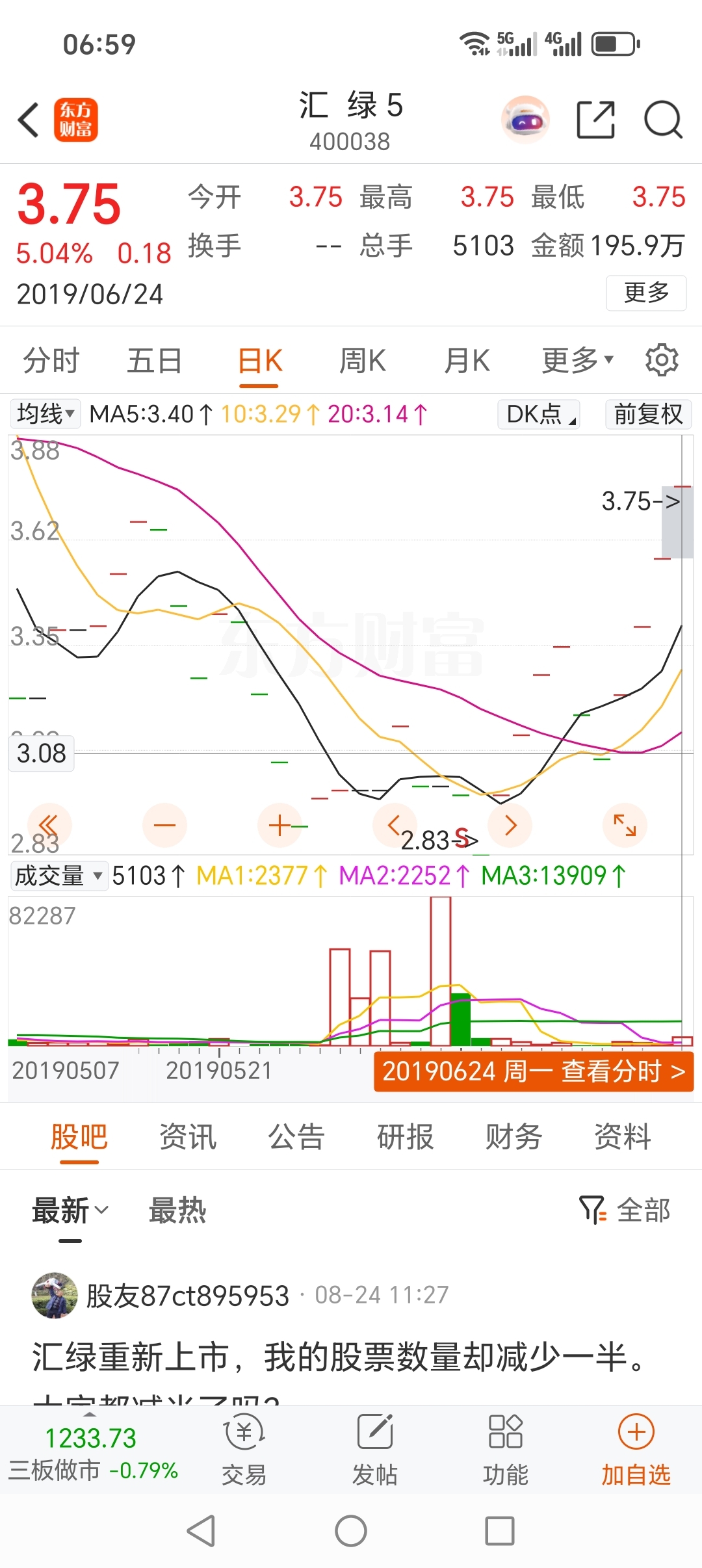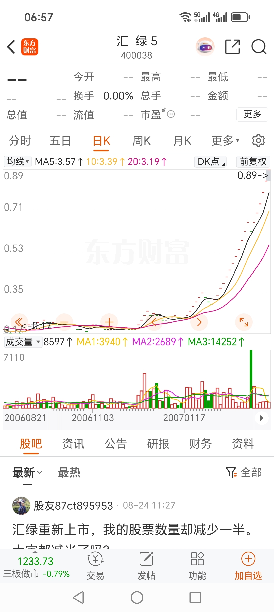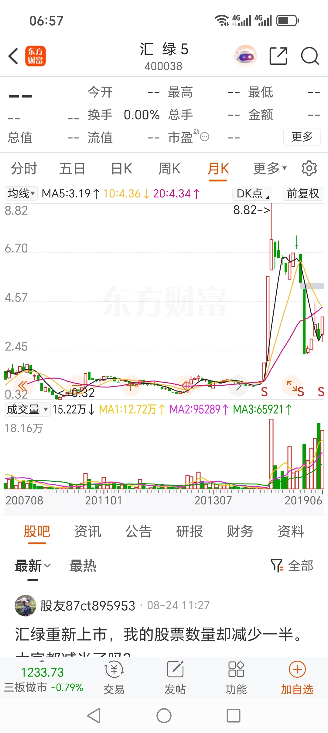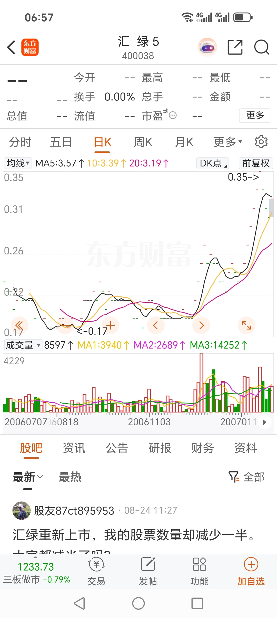 大家不要气馁,汇绿当年最后一天,停牌前还放量一把,老三板的交易不要按常规思维。