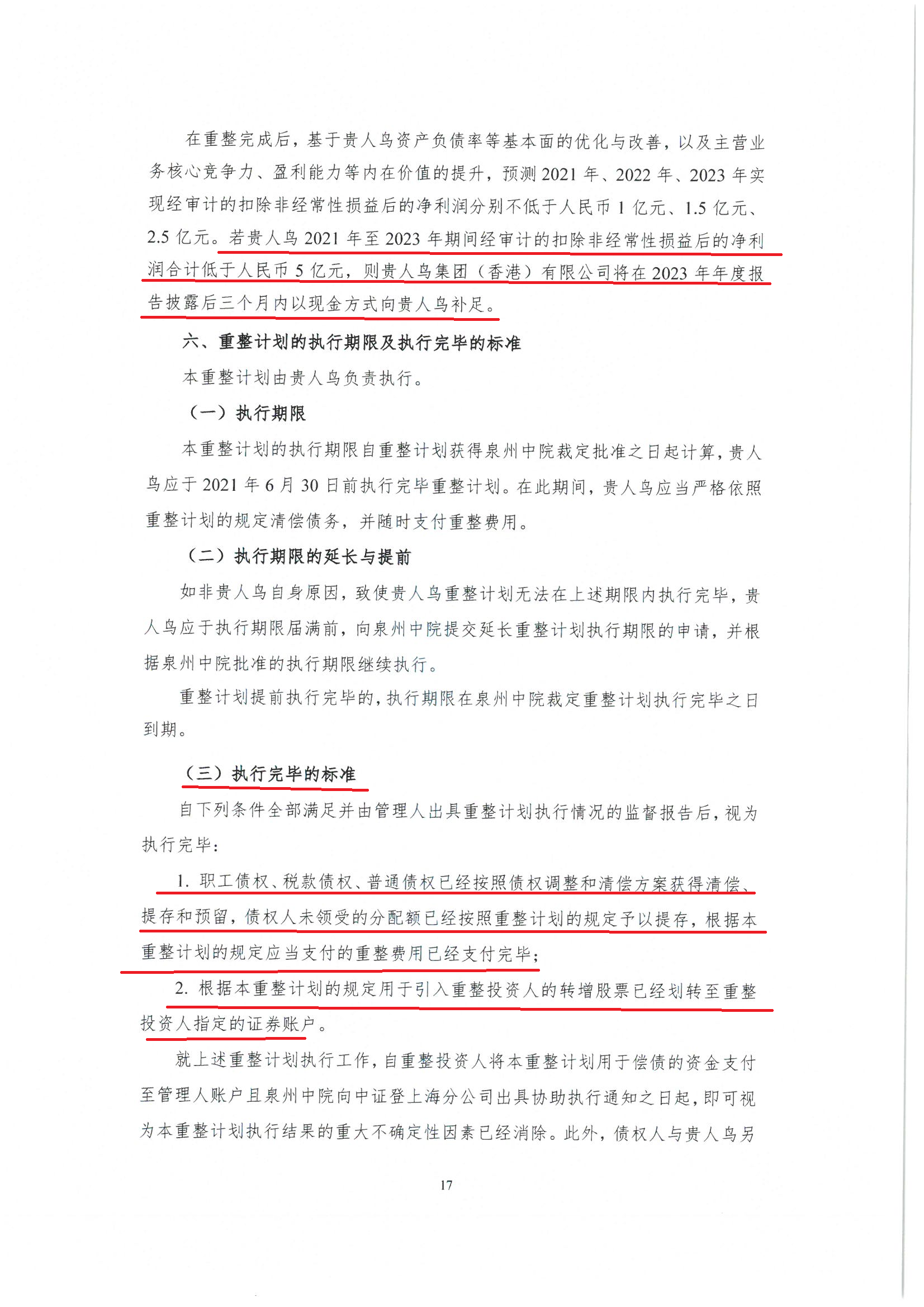 贵人鸟集团(香港)有限公司(以下简称“贵人鸟集团”或“嫌疑人”)是金鹤农业股份有限公司(原名:贵人鸟股份有限公司,原为A股上市公司,退市前股票代码:603555,退市后股票代码400208,以下简称“贵人鸟公司”)的原控股股东,其于2021年4月27日在贵人鸟股份有限公司重整计划中公开作出业绩补偿承诺并在上海证券交易所指定媒体上进行了公开披露,主要内容为:若贵人鸟公司2021年至2023年期间扣非净利润合计低于5亿元,贵人鸟集团将在 2023年年报披露后三个月内以现金方式向公司补足。(详见证据2第17页)