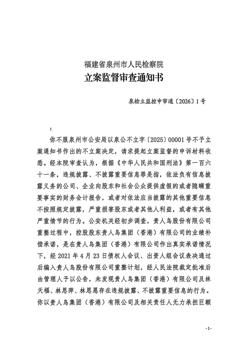 3、泉州检察院认为,未发现贵人鸟集团(香港)有限公司及林天福、林思萍、林思恩存在违规披露、不披露重要信息,控告人对此表示不予认可。