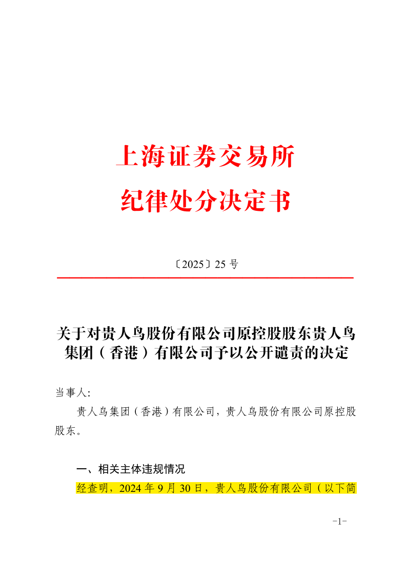 2025年1月23日,上海证券交易所对贵人鸟集团(香港)有限公司的上述违规披露重要信息的行为作出了处理决定,认定贵人鸟集团(香港)有限公司作为贵人鸟公司原控股股东向市场公开作出业绩补偿承诺,对公司日常经营和投资者的决策判断及具有重大影响,理应在承诺期限内履行,以保障上市公司利益,保护投资者权益。但公司原控股股东贵人鸟集团未按约定履行业绩补偿承诺,涉及金额巨大,严重违反了相关法律法规。(详见证据5《关于对贵人鸟股份有限公司原控股股东贵人鸟集团(香港)有限公司予以公开谴责的决定》)