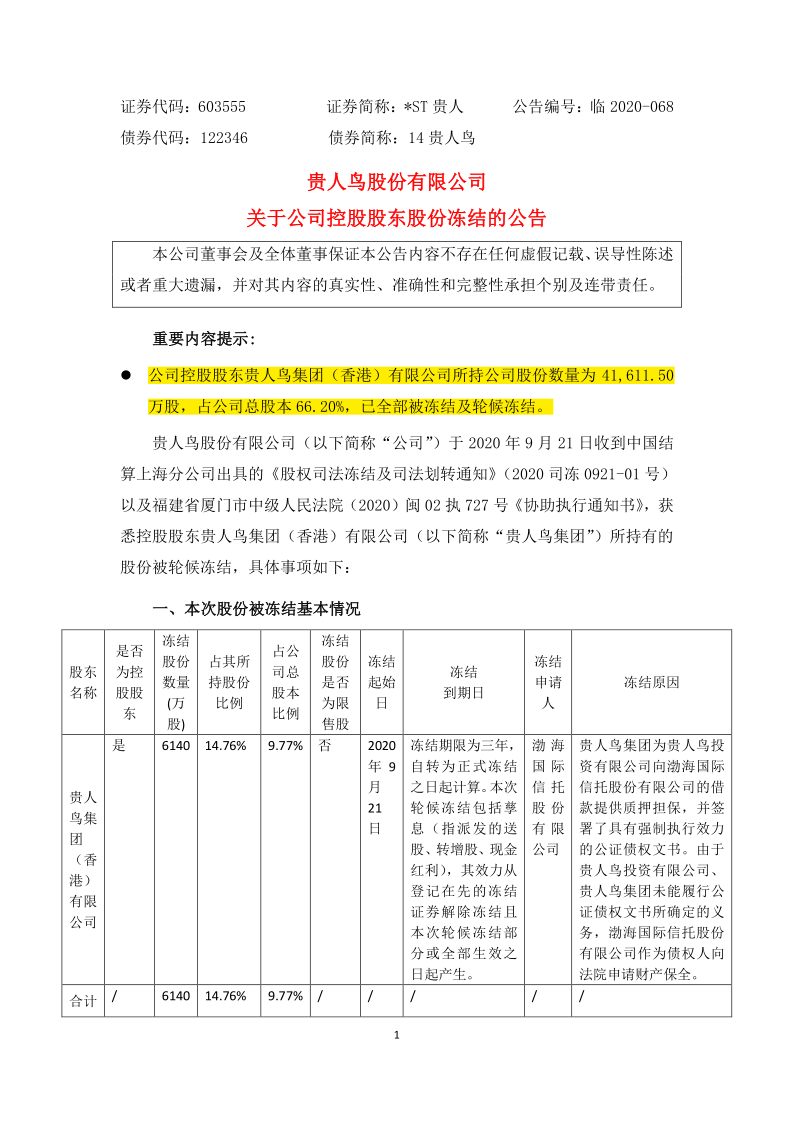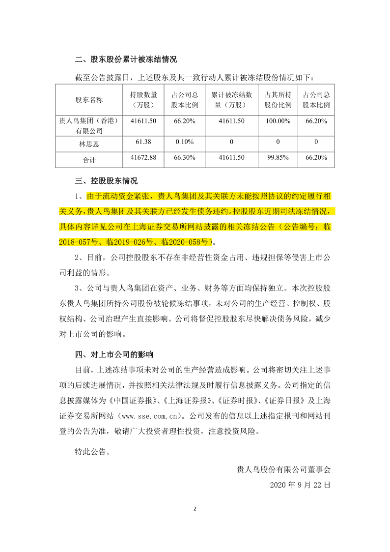 如前所述,贵人鸟公司的上述重整计划于2021年4月生效,而其当时的控股股东贵人鸟集团本身就已经深陷债务危机,根本无力偿还其自身债务,其持有的贵人鸟公司的股票4.16亿股在当年就悉数被司法机关冻结,此后几乎全部被司法拍卖。(详见证据4)