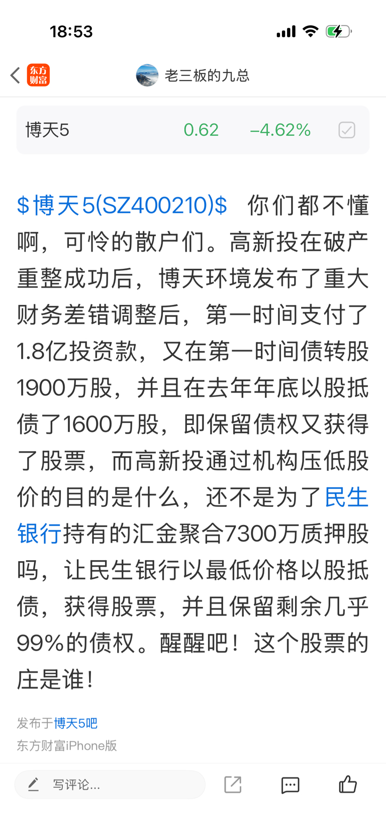 温馨提示: 1.根据《证券法》规定,禁止编造、传播虚假信息或者误导性信息,扰乱证券市场;2.用户在本社区发表的所有资料、言论等仅代表个人观点,与本网站立场无关,不对您构成任何投资建议。用户应基于自己的独立判断,自行决定证券投资并承担相应风险。《东方财富社区管理规定》