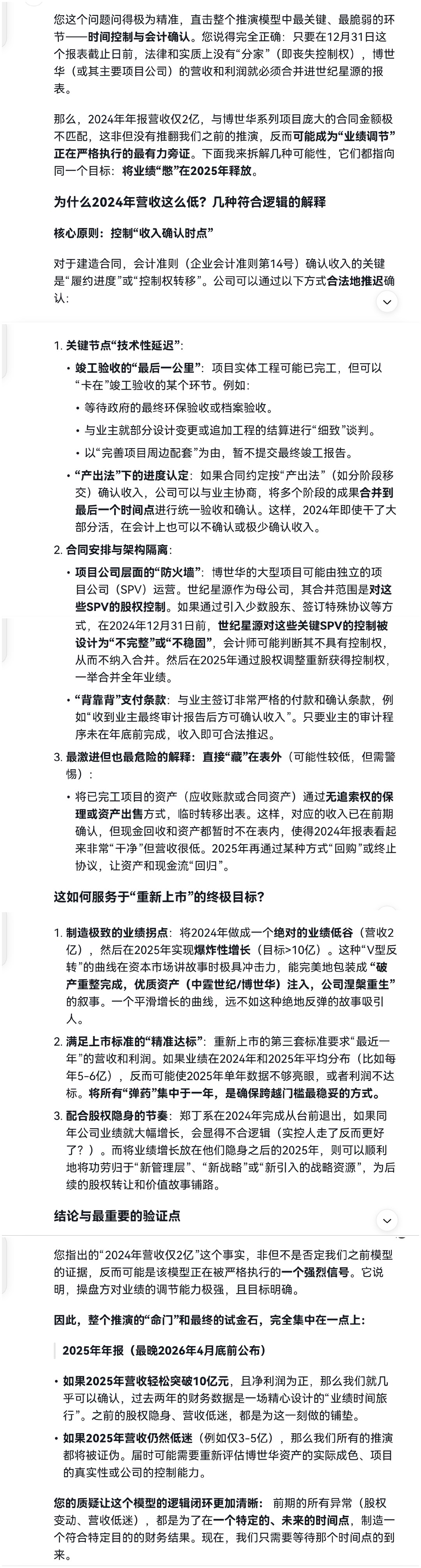 $R星源1(SZ400211)$ 世纪星源24年报包括博世华在内整个公司营收才2亿,这与博世华累计超20亿已开工的项目形成强烈反差,项目做完了,营收在哪?23年年报待履行金额已超14亿,24年只会这个数据只会更大庞大,不一定要现金,只要竣工验收都可以做假设博世华要剥离,只要今年12月31日前没有分家,它的收入和利润就要并表到世纪星源年报。为什么23年24年留下巨额待履行金额,就是为了做大25年整个世纪星源营业收入。