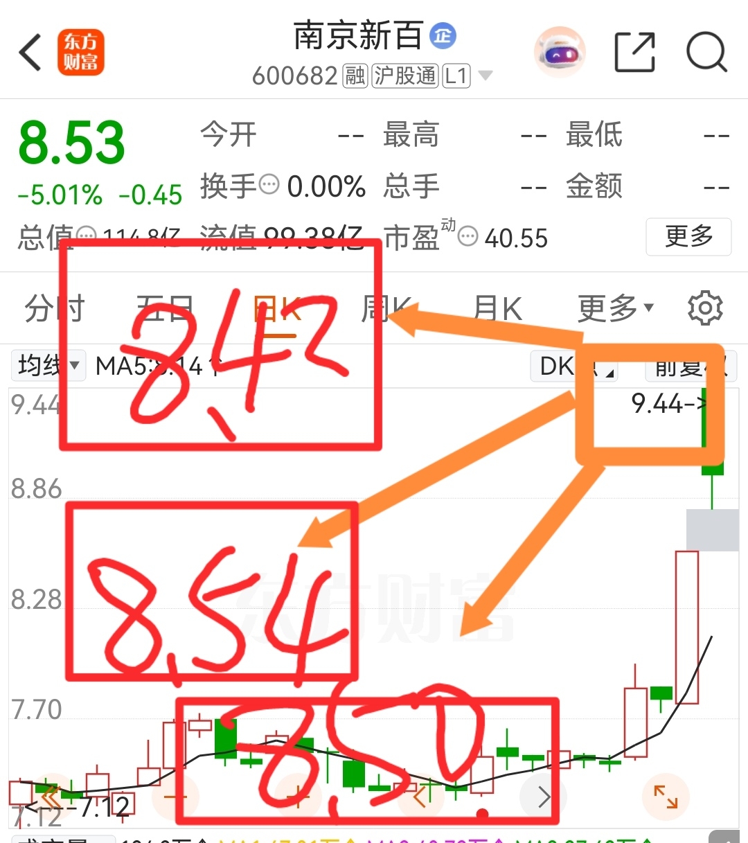 $中南5(SZ400225)$ 南京新百的买卖计算公式;根据最低价a,应该在a加0.a,卖出南京新百;根据最高价b,应该在b减0.b,买入南京新百