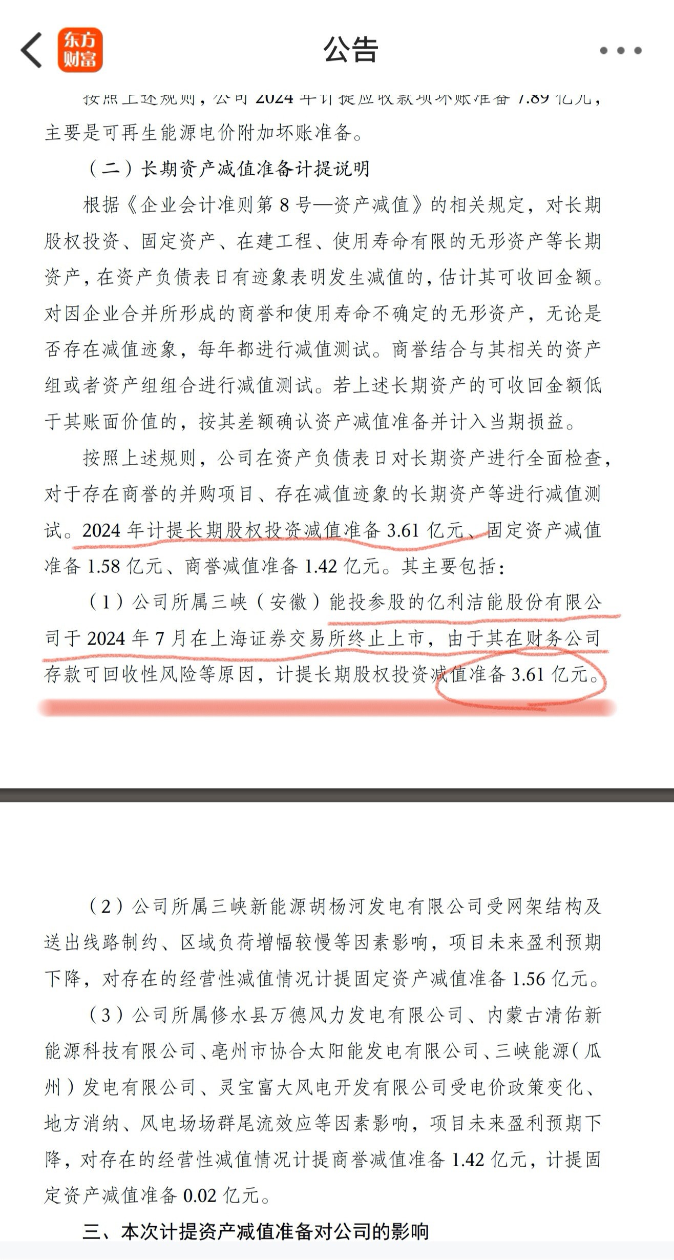 三峡能源计提亿利洁能长期股权投资减值准备,可以为我们提供投资参考。24年因财务公