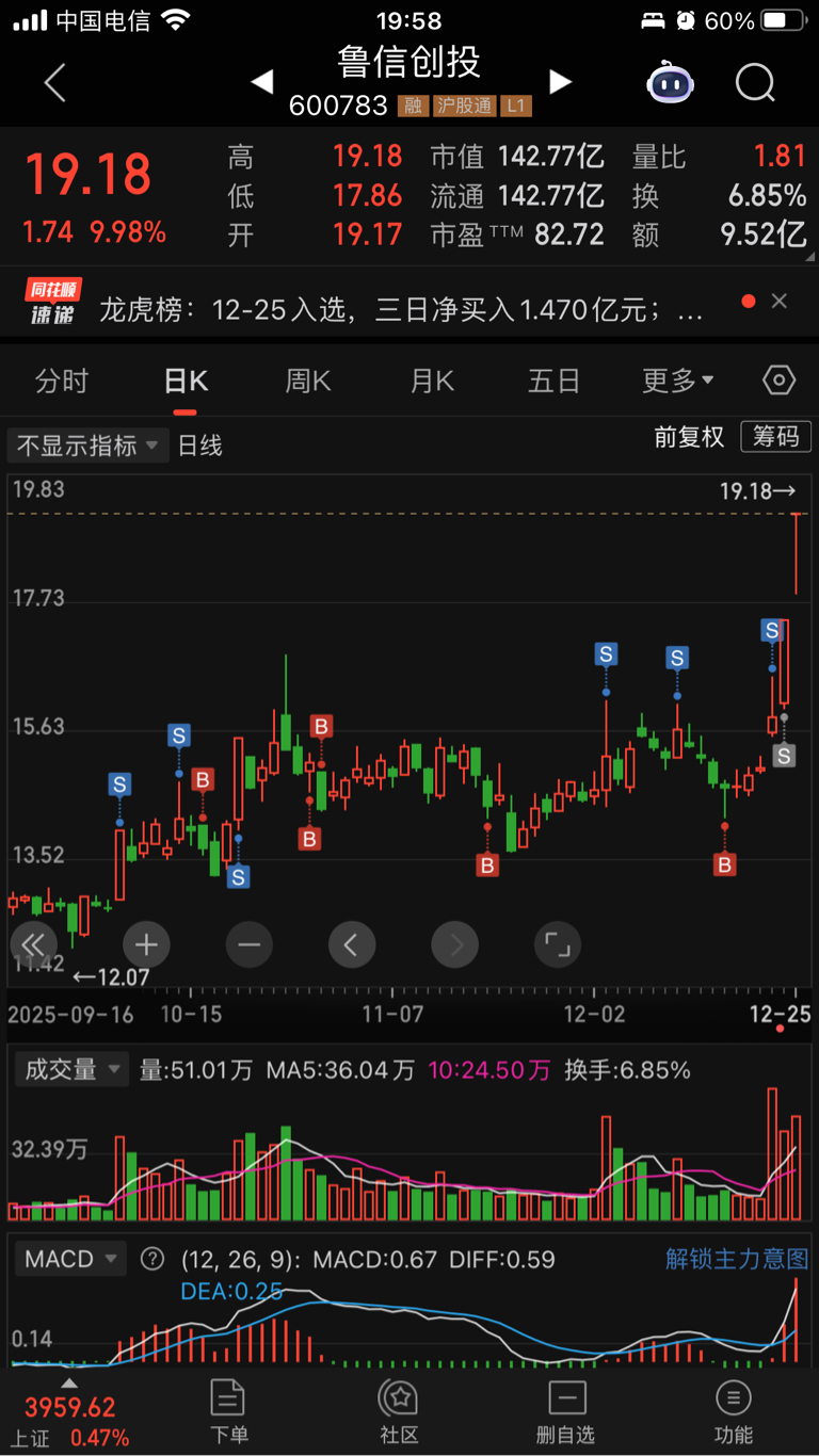 今天两只股票涨停,可惜放跑了鲁信创投,只赚了30%,就等利能5了