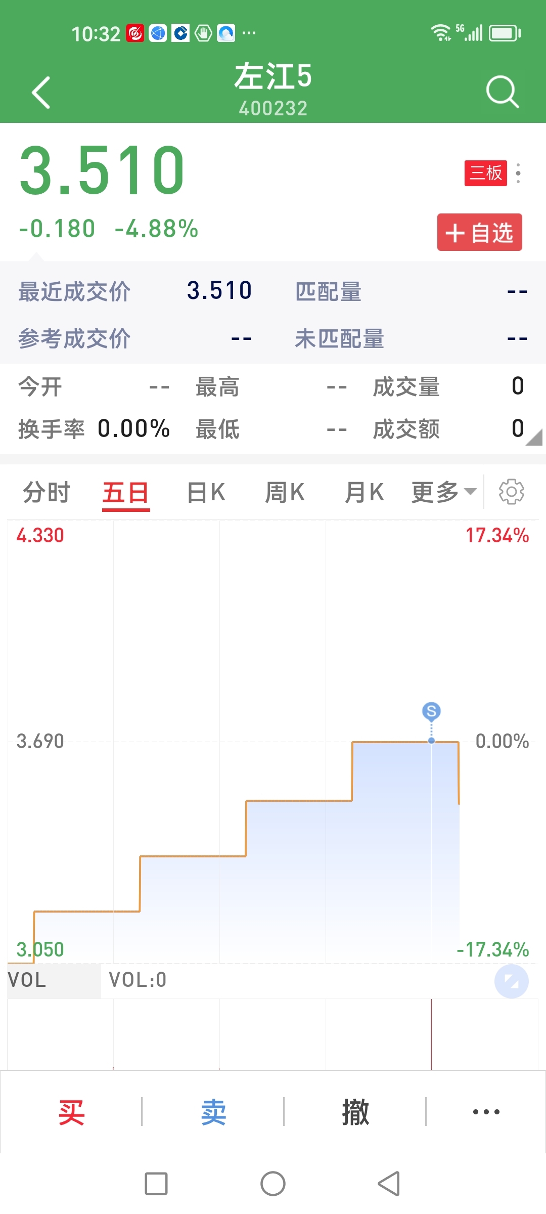 $左江5(SZ400232)$ 妈的昨天涨停1毛7,今天跌停要1毛8,怎么算的。还好昨天走了点。