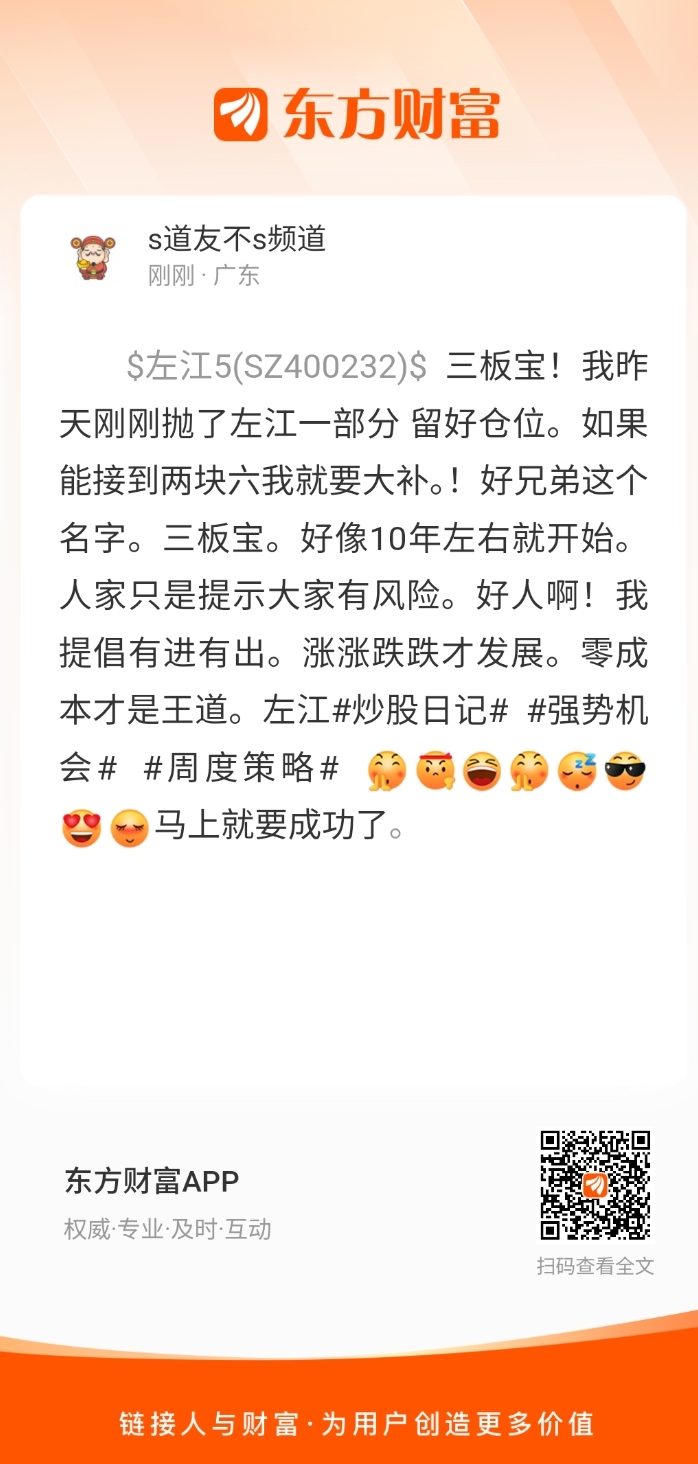 $左江5(SZ400232)$ 三板宝兄 努力努力。干到2.6。上次T完了。期待下次!!有涨有跌,有进有出。才能和谐发展。零成本才是王道。应该差一次就可以T