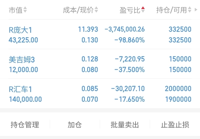 $*ST立方(SZ300344)$ $*ST长药(SZ300391)$ $R庞大1(SZ400171)$ 昨天晚上一夜无眠,抽了三包烟看着一地的烟头,全是后悔满仓买入庞大1,现在亏了300多w了,贪婪之心让我现在一无所有,破产清算所有积蓄就这样化为乌有,我知道这次打击让我彻底翻不了身了,对我来说没有了未来和希望,以后股市就算来了大牛市,也和我无关了,因为已经没有资本去扳回损失。可能现实就是这么残酷,抱着让生活更美好的幻想投资股市,是我这辈子最错误的决定!
