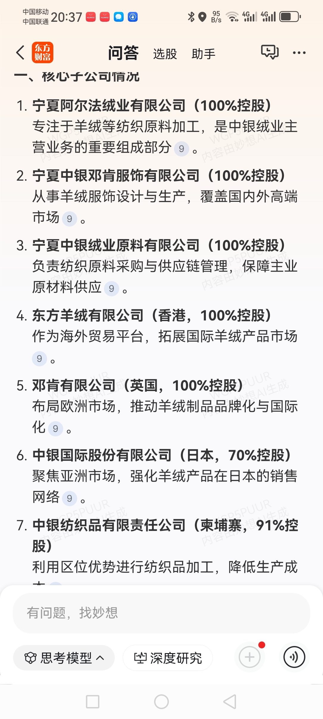 中银5实力不容小屈!羊绒纺织业九家控股子公司!
