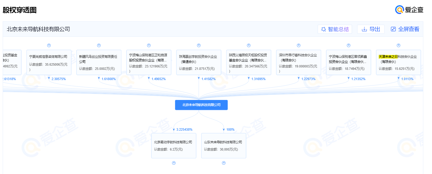 - 第三层:天津未来之日科技合伙企业持有北京未来导航科技有限公司约1.0113%的股权。