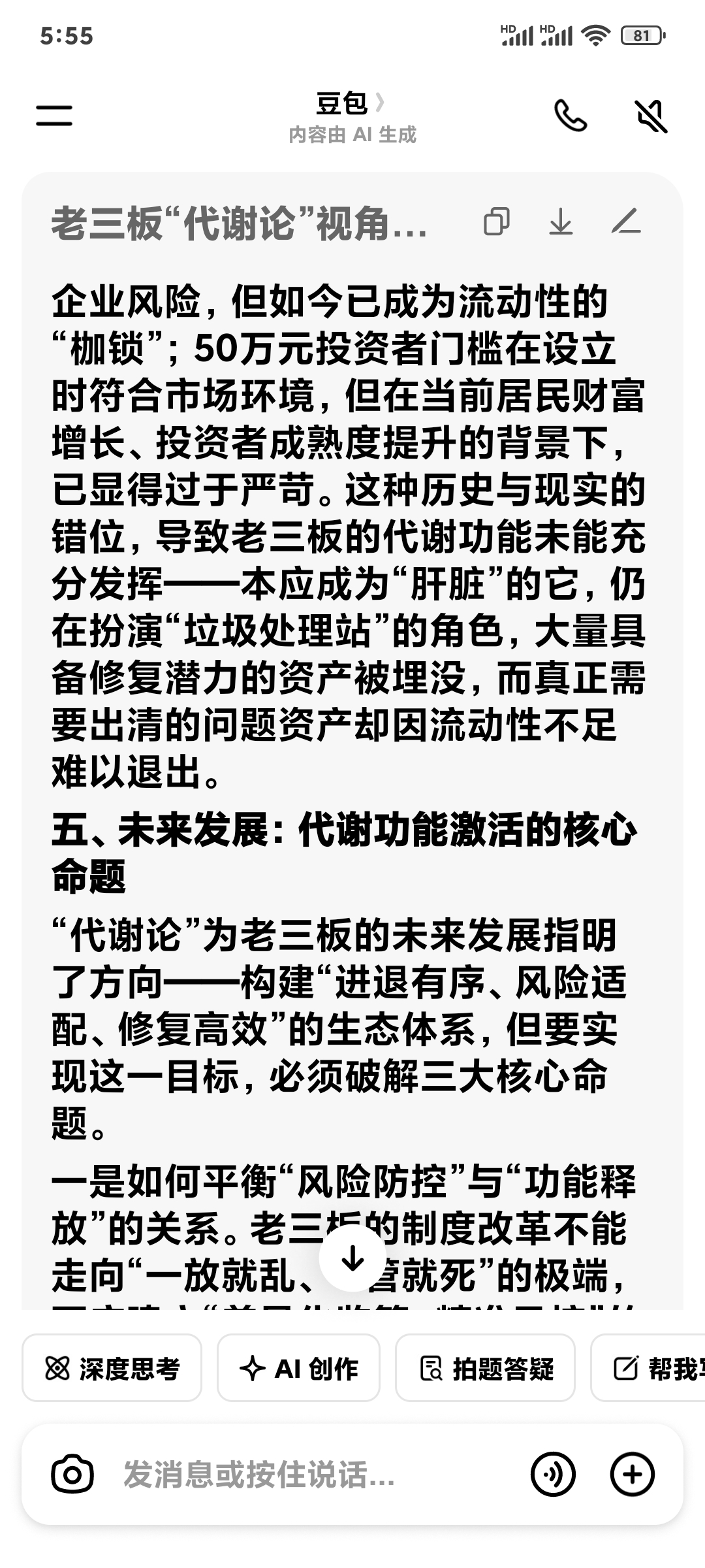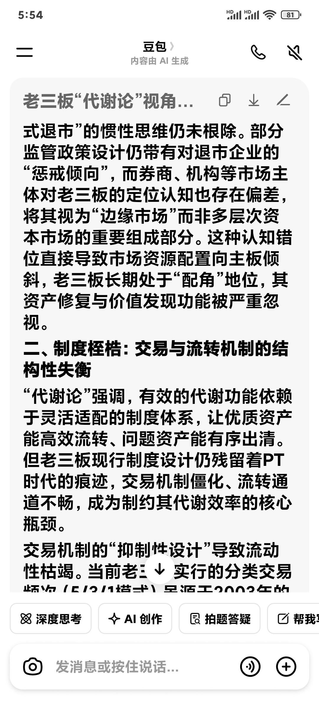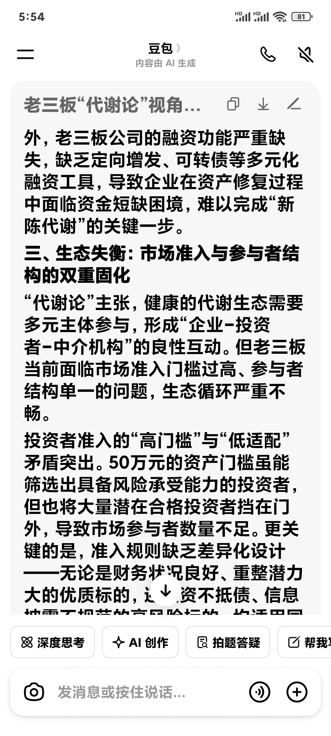 这篇文章从“代谢论”核心逻辑出发,层层拆解了老三板在认知、制度、生态、发展四个维度的深层问题,结合了历史改革背景与当前市场现状。若你需要进一步聚焦某一细分领域(如交易制度优化方案、投资者教育具体路径等),或补充特定案例、数据支撑,可随时告知,我将针对性深化内容。也可根据使用场景(如投研报告、政策建议、市场科普)调整行文风格与侧重点。