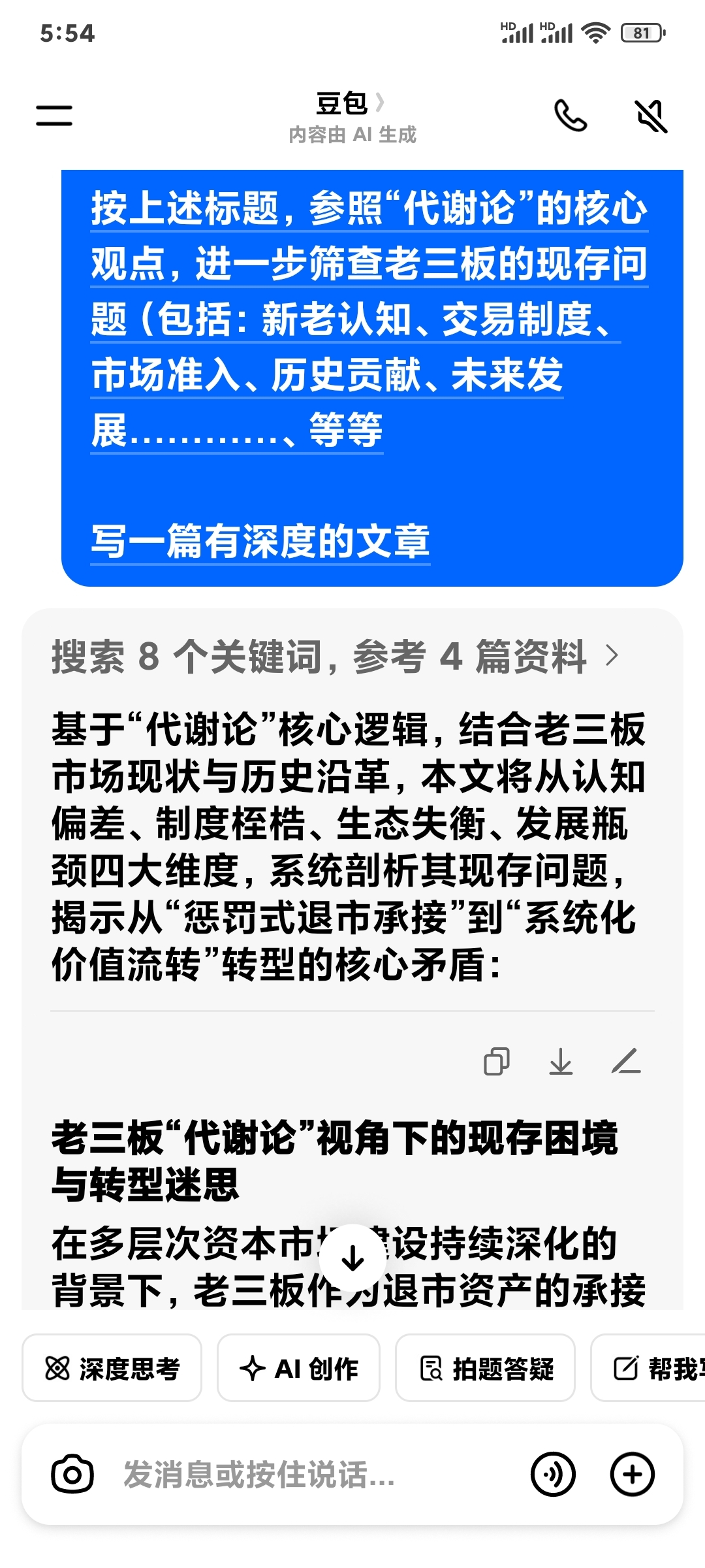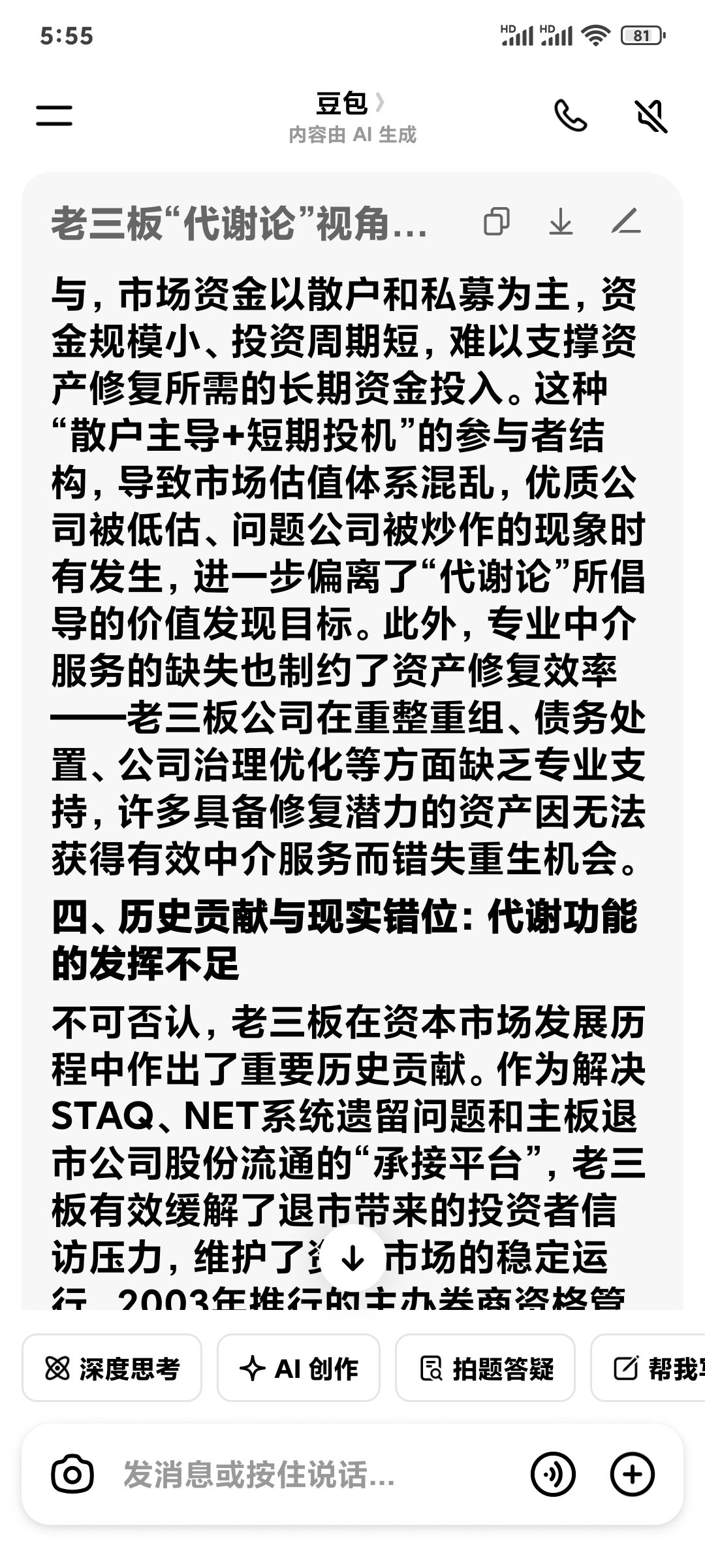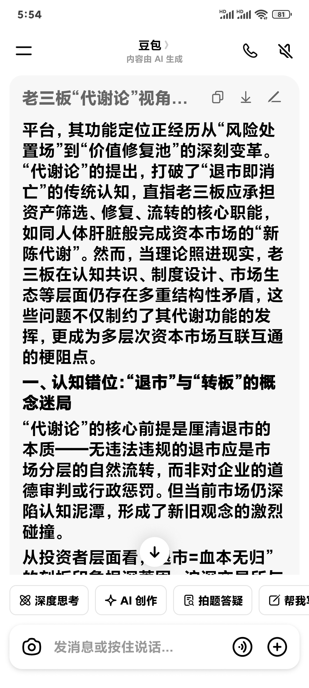 这篇文章从“代谢论”核心逻辑出发,层层拆解了老三板在认知、制度、生态、发展四个维度的深层问题,结合了历史改革背景与当前市场现状。若你需要进一步聚焦某一细分领域(如交易制度优化方案、投资者教育具体路径等),或补充特定案例、数据支撑,可随时告知,我将针对性深化内容。也可根据使用场景(如投研报告、政策建议、市场科普)调整行文风格与侧重点。