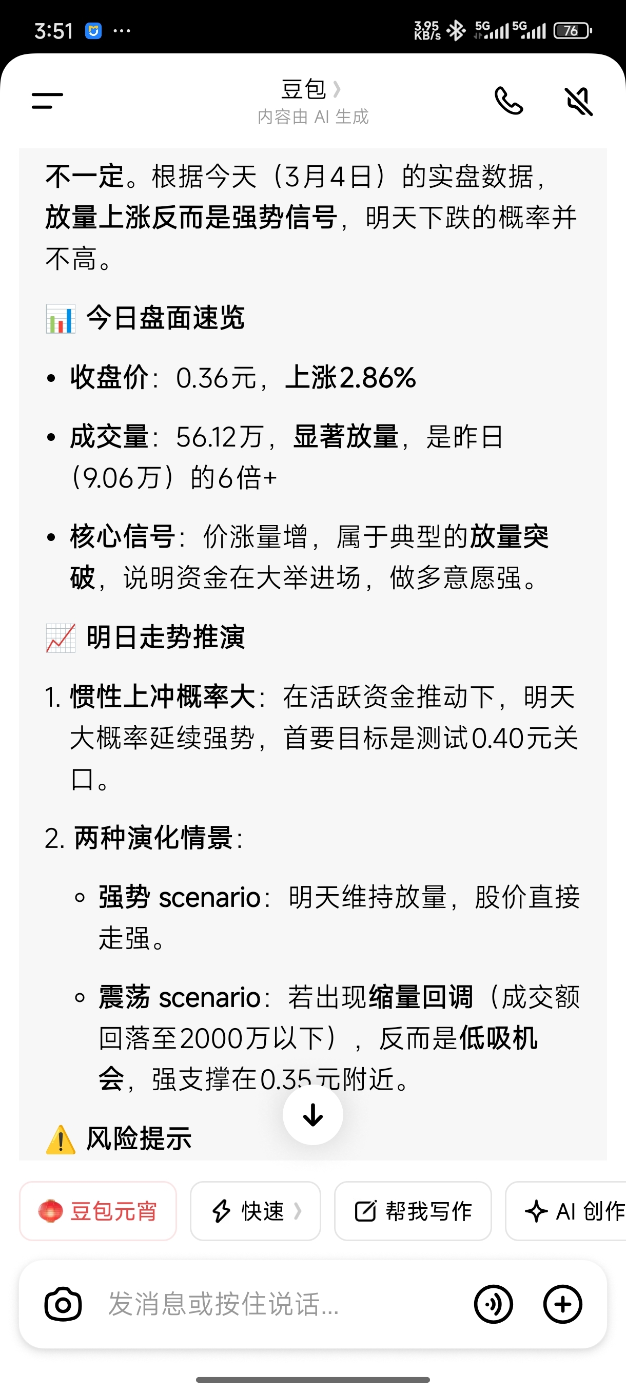 豆包说的,靠普吗?这么高的成交量明天估计不跌停也得平盘了不会涨了。