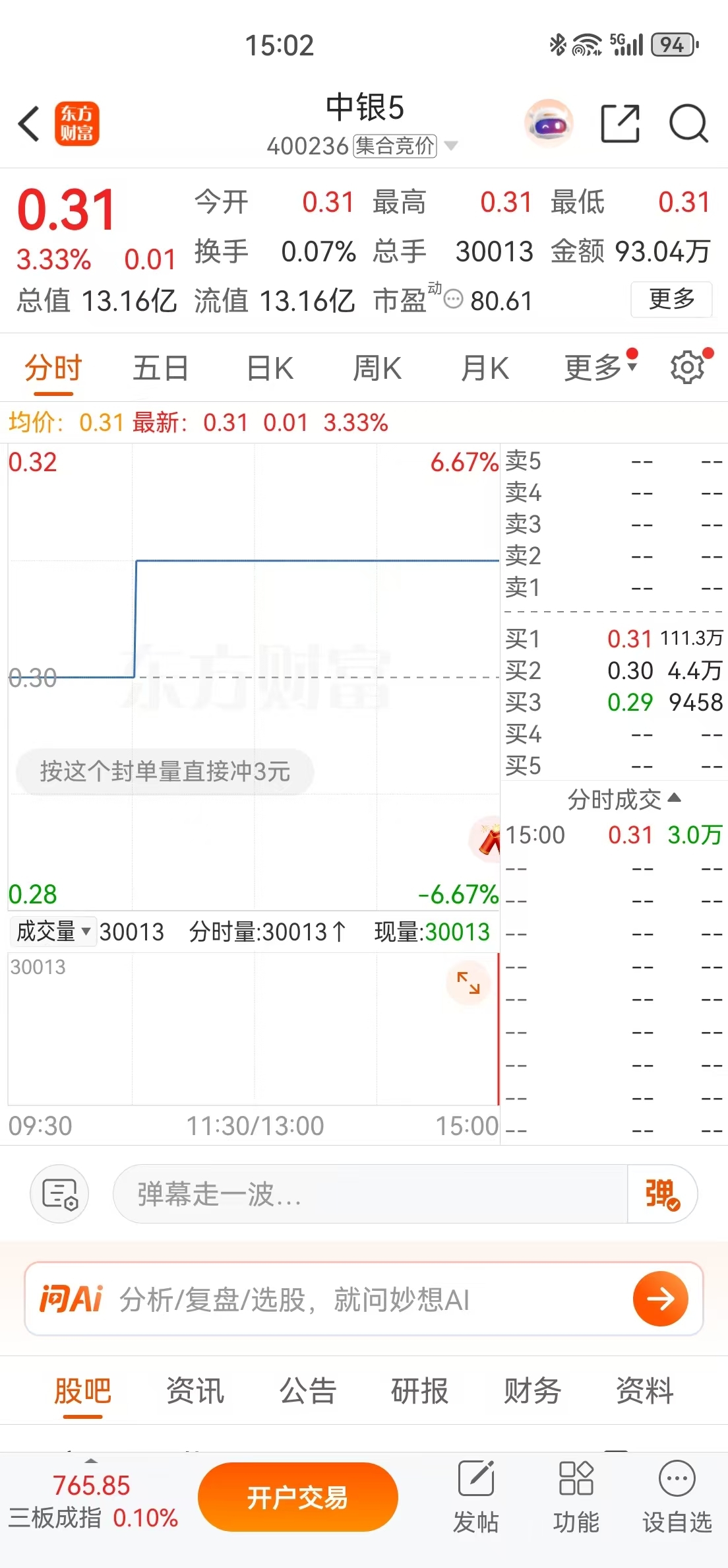 $中银5(SZ400236)$ 和0.31那会一样的封单,涨两分稳稳的了。